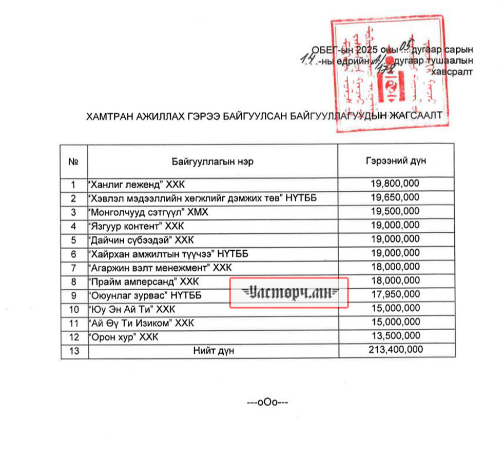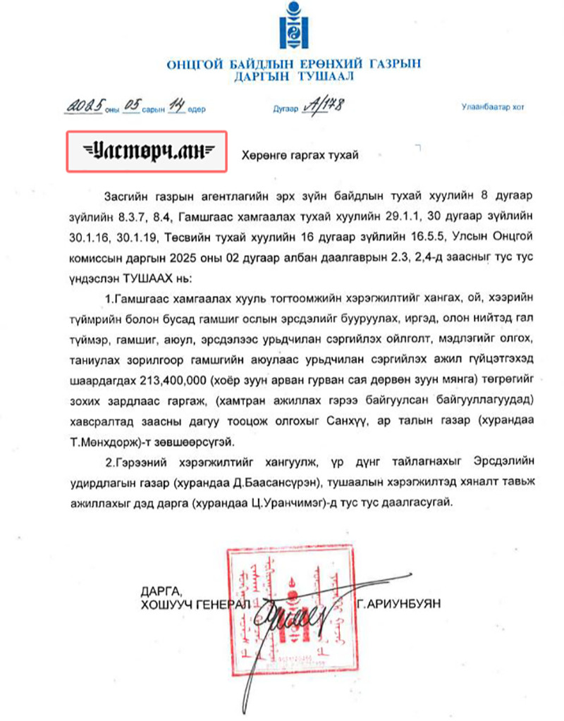 Тодруулбал ОБЕГ-ЫН дарга, ХОШУУЧ ГЕНЕРАЛ Г.АРИУНБУЯН 2025 оны 05 дугаар сарын 14-нд А/178 тоот “ХӨРӨНГӨ ЗАРЦУУЛАХ ТУХАЙ” тушаал гаргаж 213 сая 400 мянганган төгрөгийг ОЛОН НИЙТЭД МЭДЭЭЛЭЛ ДАМЖУУЛАХ, УРЬДЧИЛАН СЭРГИЙЛЭХ гэсэн утгаар зарцуулах төсвийг гаргасан байна.