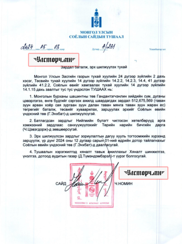 Тэгвэл Соёлын сайд байхдаа 2024 оны 05 дугаар сарын 03-нд А/321 тоот тушаал гаргаж Монголын бурханы шашинтны Төв Гандантэгчилэн хийдийн сүм хийдийн цэвэрлэгээ, өнгө будгийг сэргээх ажилд 512 сая 675 мянган төгрөгийн төсвийг өгч байжээ. Гэвч нохойн толгойг ширээн дээр залахаар шороон дээр унана гэгчээр өнгө зүсээ ч сольсон зүйлгүй, чимээ аниргүй, таг чиг байна.