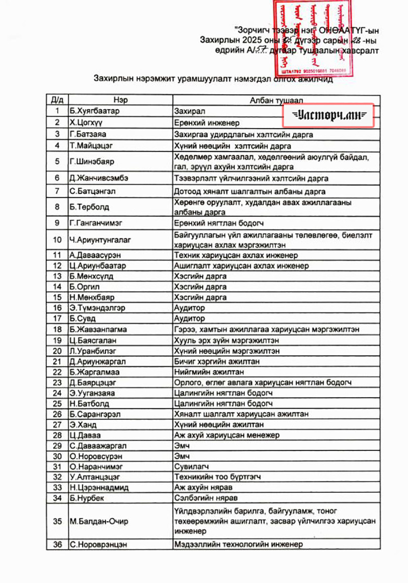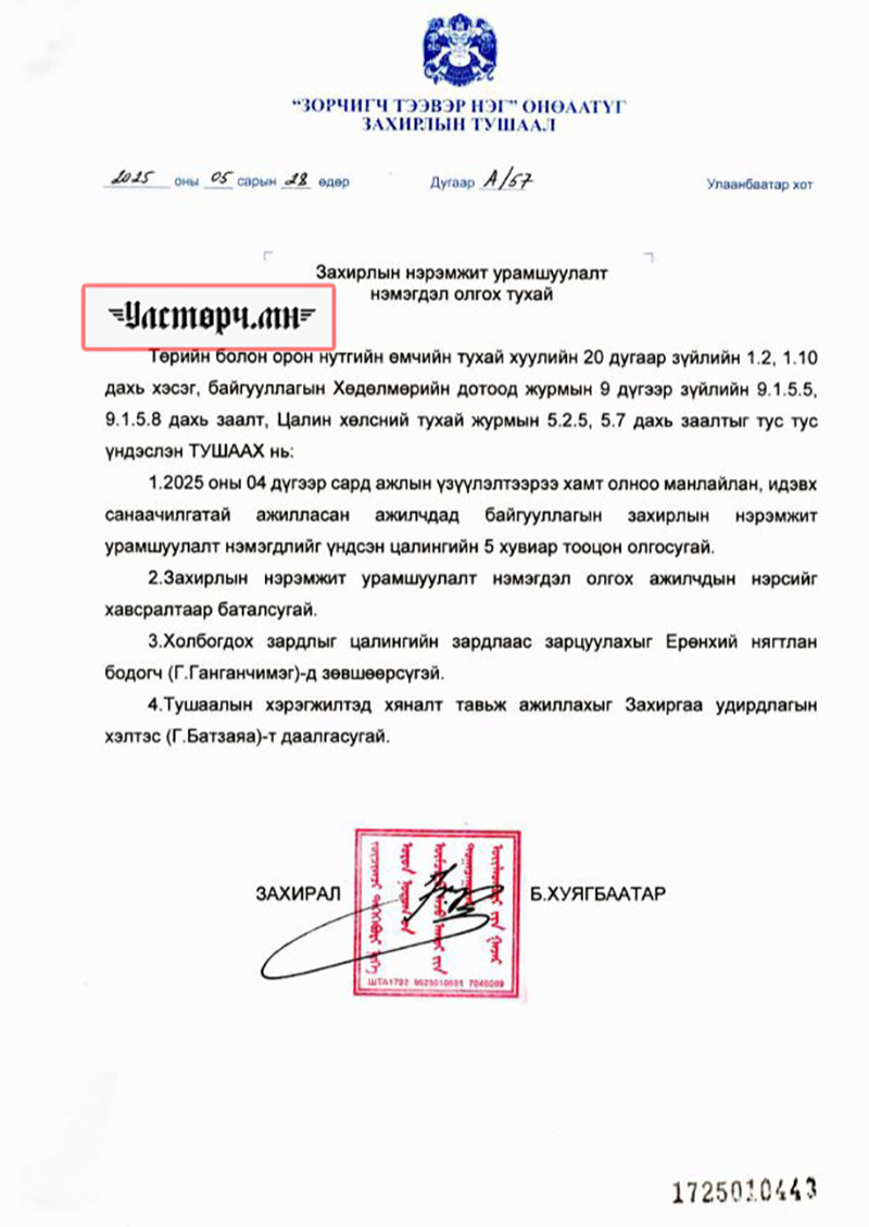 Гэтэл “Автобус 1”-ийн захирал Б.ХУЯГБААТАР өлмөн зэлмүүн өссөн юм болов уу хөөрхий, ажилчидтайгаа хамт УРАМШУУЛАЛ авч, өөрт давуу байдал үүсгэсэн байна. Цагаан дээр хараар бичиж, улаан дардастай тамга дарсан 2025 оны 05 дугаар сарын 28-ний өдрийн А/57 тоот тушаал нь үүнийг гэрчилнэ.