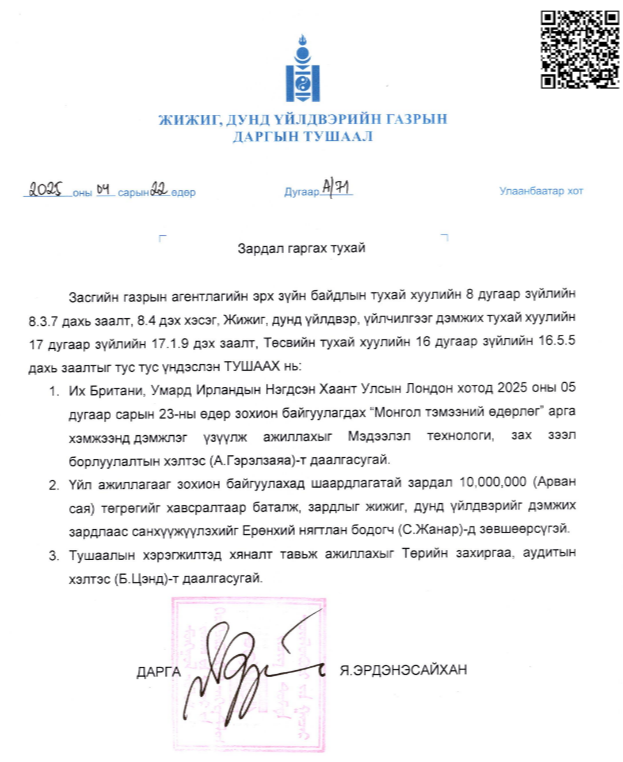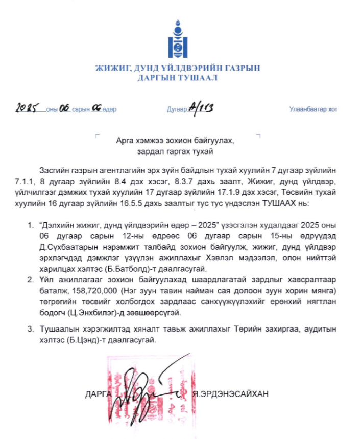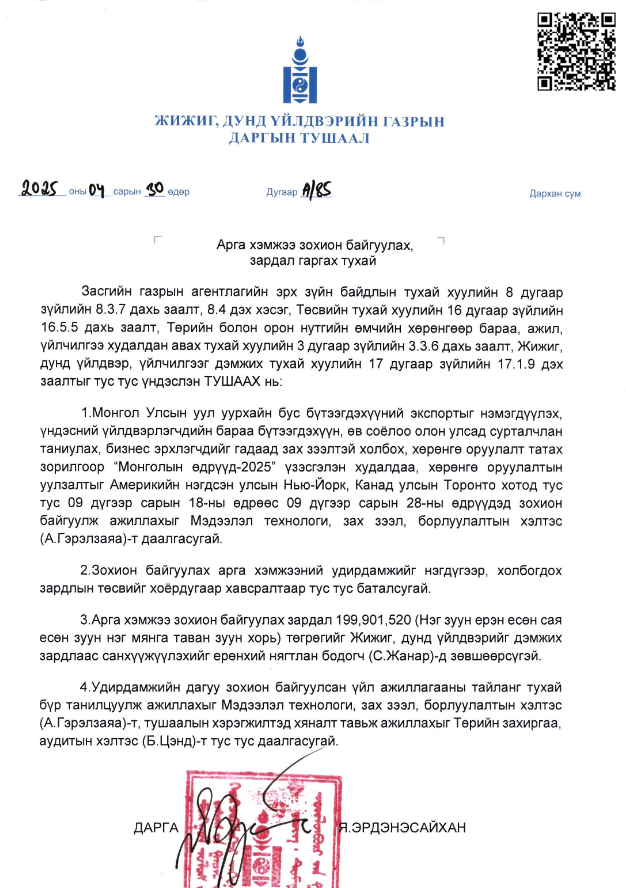 2025 оны 06 сарын 06-ны өдөр Сүхбаатарын талбайд 158,720,000₮-өөр "Дэлхийн жижиг, дунд үйлдвэрийн өдөр 2025" үзэсгэлэнг зохион байгуулжээ.