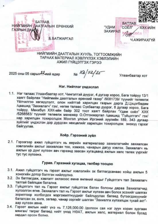 2025 оны 05 дугаар сарын 22-ны өдөр "УДАМ СОЁЛ" компанитай 7 САЯ 100 МЯНГАН төгрөгөөр ТАРААХ МАТЕРИАЛ хийлгэх,