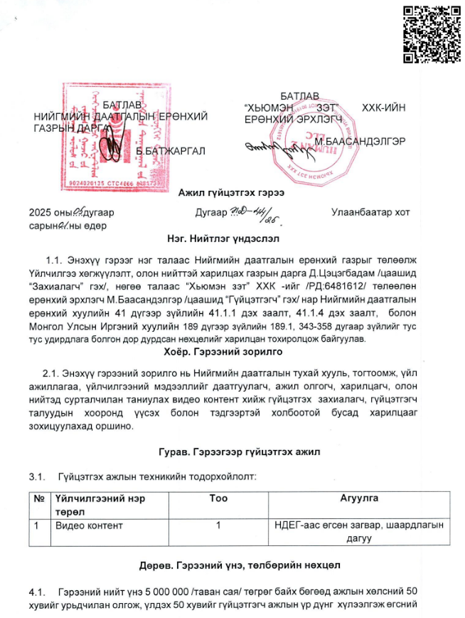 2025 оны 05 дугаар сарын 01-ний өдөр "ХЬЮМАН ЗЭТ" компанитай 5 САЯ төгрөгөөр 1 ширхэг видео контент хийлгэх,