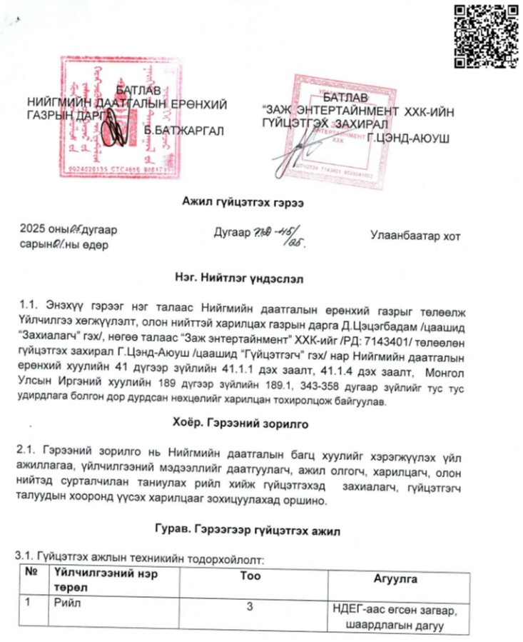 2025 оны 05 дугаар сарын 01-ний өдөр "ЗАЖ ЭНТЕРТАЙМЕНТ" компанитай 3 САЯ 600 МЯНГААР 3 ширхэг рийл хийлгэх,