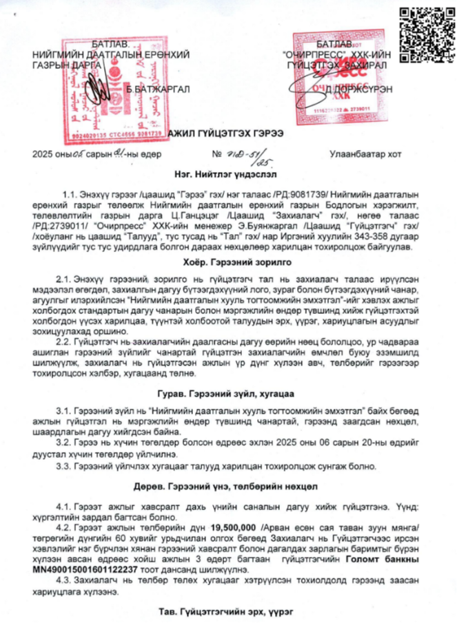 2025 оны 05 дугаар сарын 21-ний өдөр "ОЧИРПРЕСС" компанитай 19 САЯ 500 МЯНГАН төгрөгөөр ХУУЛИЙН ЭМХТГЭЛ хийлгэх,