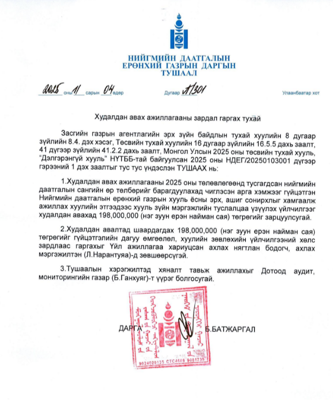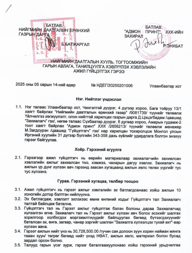 2025 оны 05 дугаар сарын 14-ний өдөр "АДМОН ПРИНТ" компанитай 30 САЯ 700 МЯНГА,