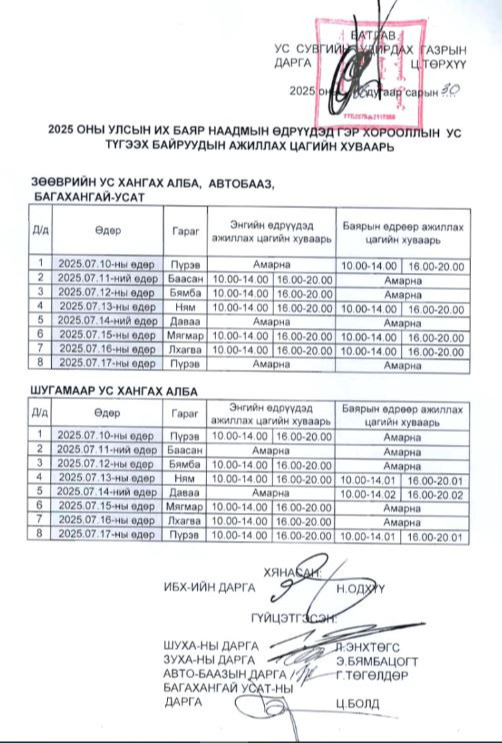 гэр хорооллын ус түгээх байруудын наадмаар амрах цагийн хуваарь