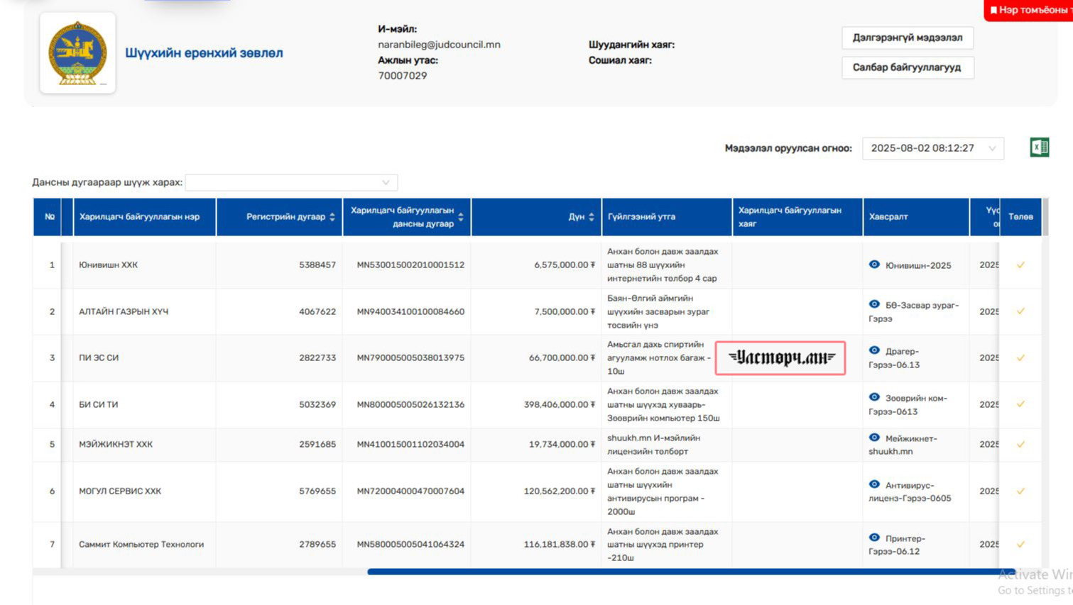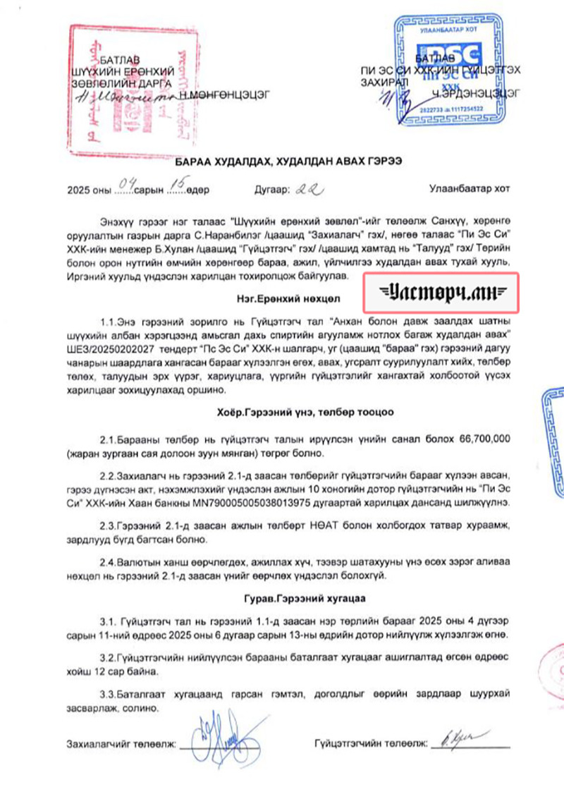 ШЕЗ-ийн дарга Н.МӨНГӨНЦЭЦЭГИЙН 2025 оны 04 дүгээр сарын 15-нд “ПИ ЭС СИ” ХХК-ийн гүйцэтгэх захирал Ч.ЭРДЭНЭЦЭЦЭГТЭЙ байгуулсан “баруу худалдах, худалдан авах” 22 тоот гэрээнд “Анхан болон давж заалдах шатны шүүхийн албан хэрэгцээнд амьсгал дахь спиртийн агууламж нотлох багаж” буюу согтууруулах ундаа хэмжигч ДРАГЕРЫГ 66 сая 700 мянган төгрөгөөр худалдан авсан байна.