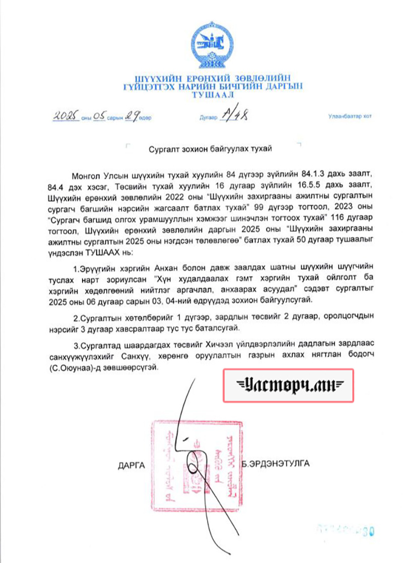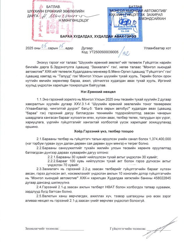 Тодруулбал, ШЕЗ-ийн дарга Н.МӨНГӨНЦЭЦЭГ 2025 оны 5 дугаар сарын 15-нд “МОНГОЛ ХЬЮНДАЙ АВТОМОТИВ” ХХК-ийн гүйцэтгэх захирал Л.МЭНДСАЙХАНТАЙ “бараа худалдах, худалдан авах” тухай гэрээ байгуулж 1 тэрбум 374 сая 400 мянган төгрөгөөр “бага оврын автобус” худалдан авчээ. Гэвч автобус худалдан авах үндсэн өртөг гэж улсын төсвөөс 2 тэрбум 296 сая төгрөгийн ГЭРЭЭ ДҮГНЭСЭН МАЯГТЫГ бөглөсөн байна. Тэгэхээр ахиад 1 тэрбум гаруй төгрөг сох дутаж байгаа бөгөөд худалдаж авсан өөр зүйл байхгүй учир дарга нар нь өөр хоорондоо үгсэн тохирч голдоо цувчуулсан байж болзошгүй юм.