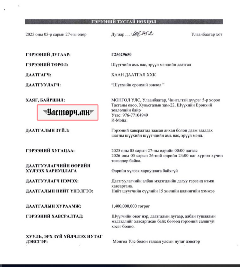 Мөн өнгөрөгч оны 05 дугаар сарын 27-ний өдөр “ХААН ДААТГАЛ” ХХК-тай 1 тэрбум 400 мянган төгрөгийн гэрээ байгуулж “шүүгчдийн амь нас, эрүүл мэндийн даатгал” хийлгэсэн байна.