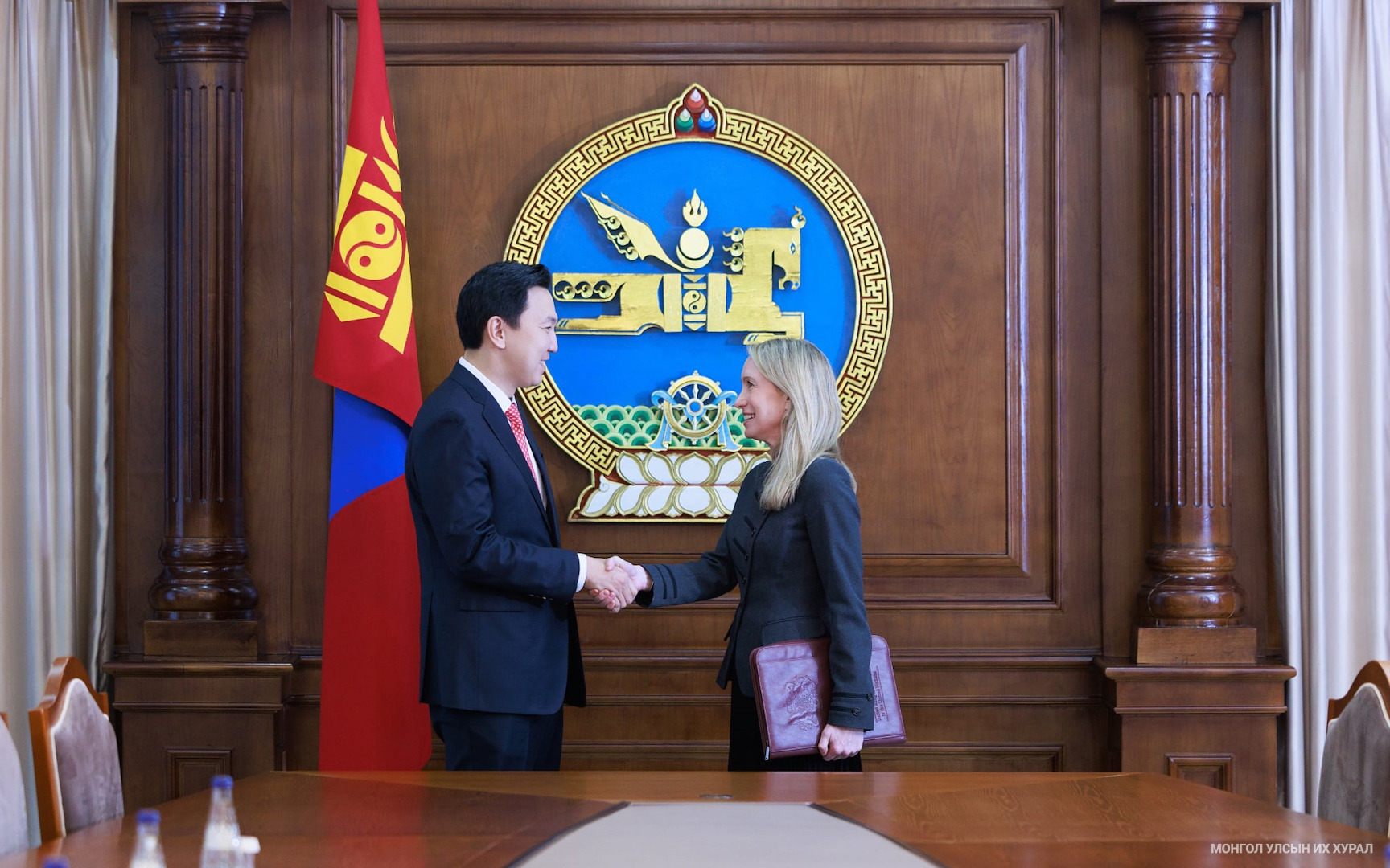Монгол Улсын Их Хурлын дарга Н.Учрал өнөөдөр (2026.02.05) Их Британи, Умард Ирландын Нэгдсэн Хаант Улсаас Монгол Улсад суугаа Элчин сайд Фиона Блайтыг хүлээн авч уулзлаа