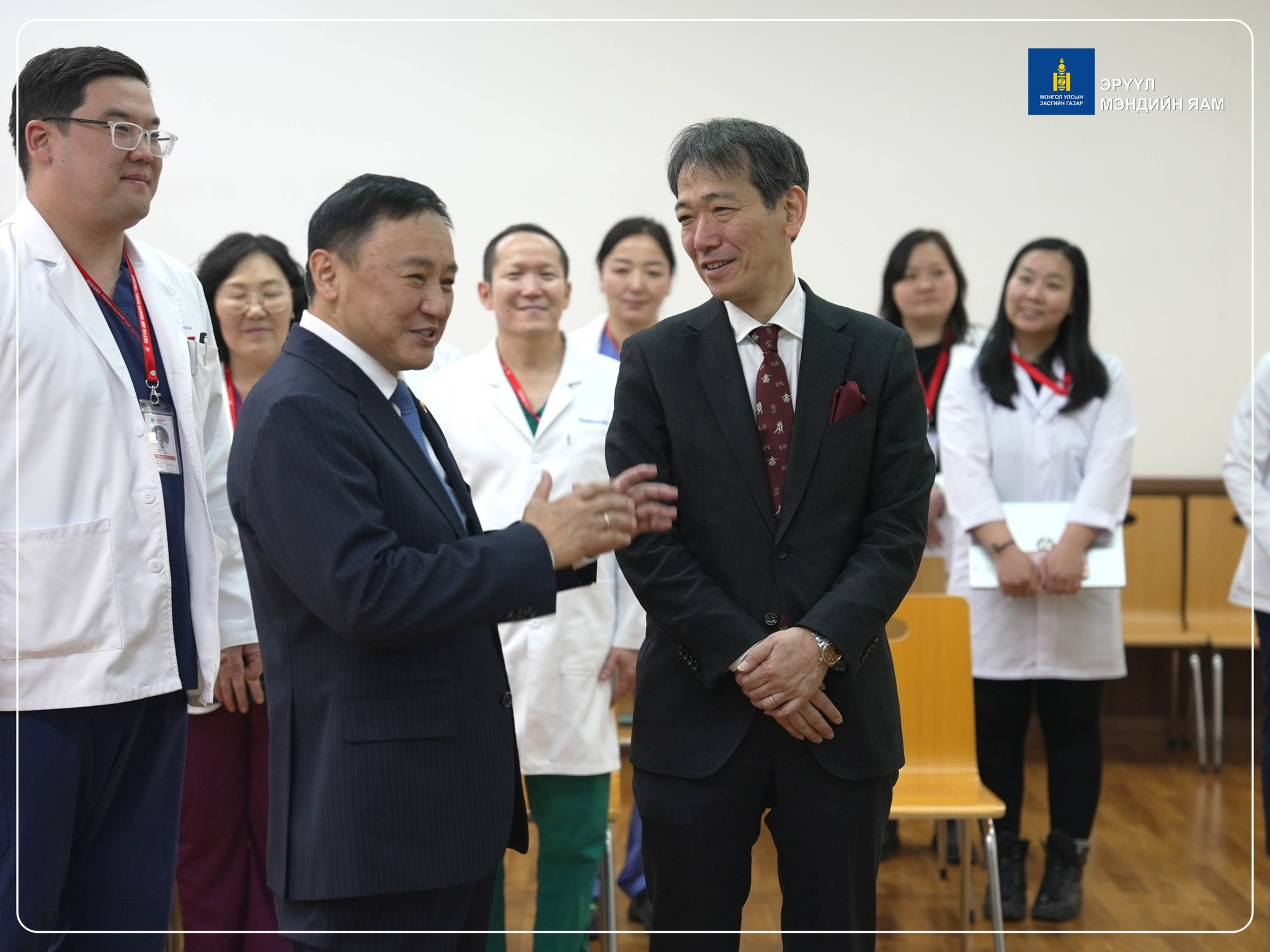 Хүндэт зочдыг Эрүүл мэндийн сайд Ж.Чинбүрэн, АШУҮИС-ийн Эмнэлэг эрхэлсэн проректор Д.Цэрэндагва, Монгол–Японы эмнэлгийн захирал П.Баясгалан, эмнэлгийн удирдлагууд хүлээн авч уулзлаа.