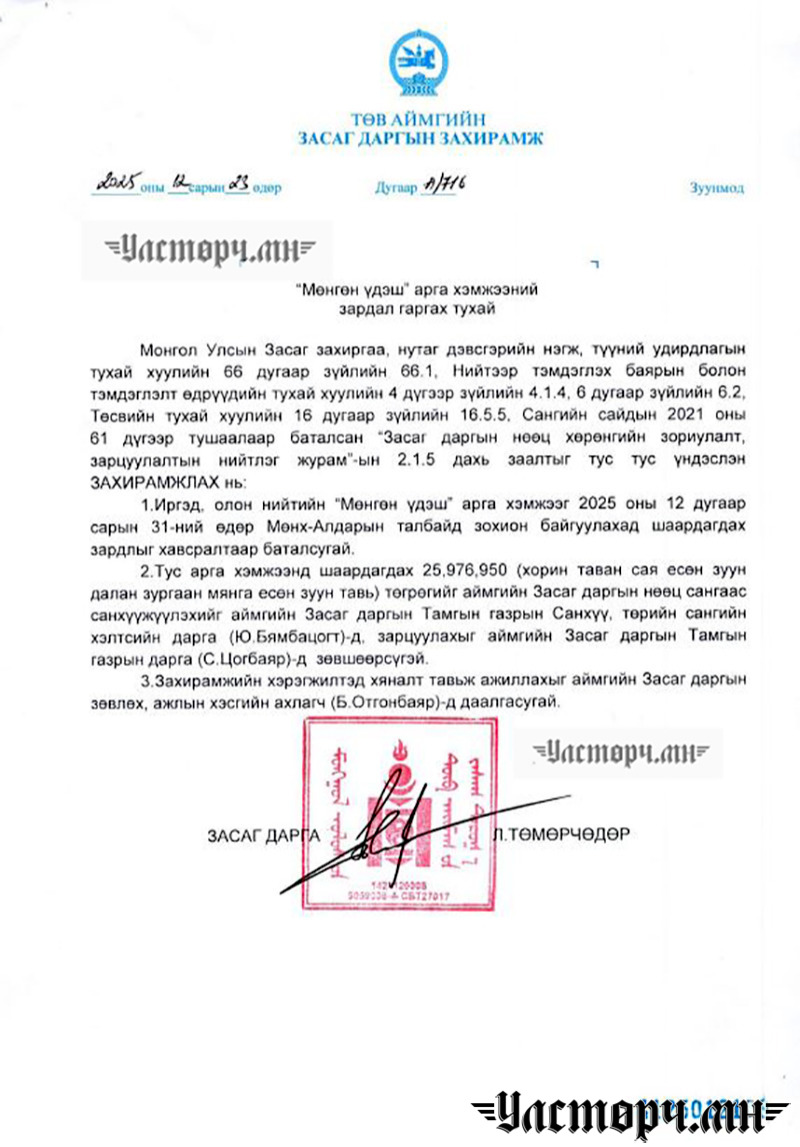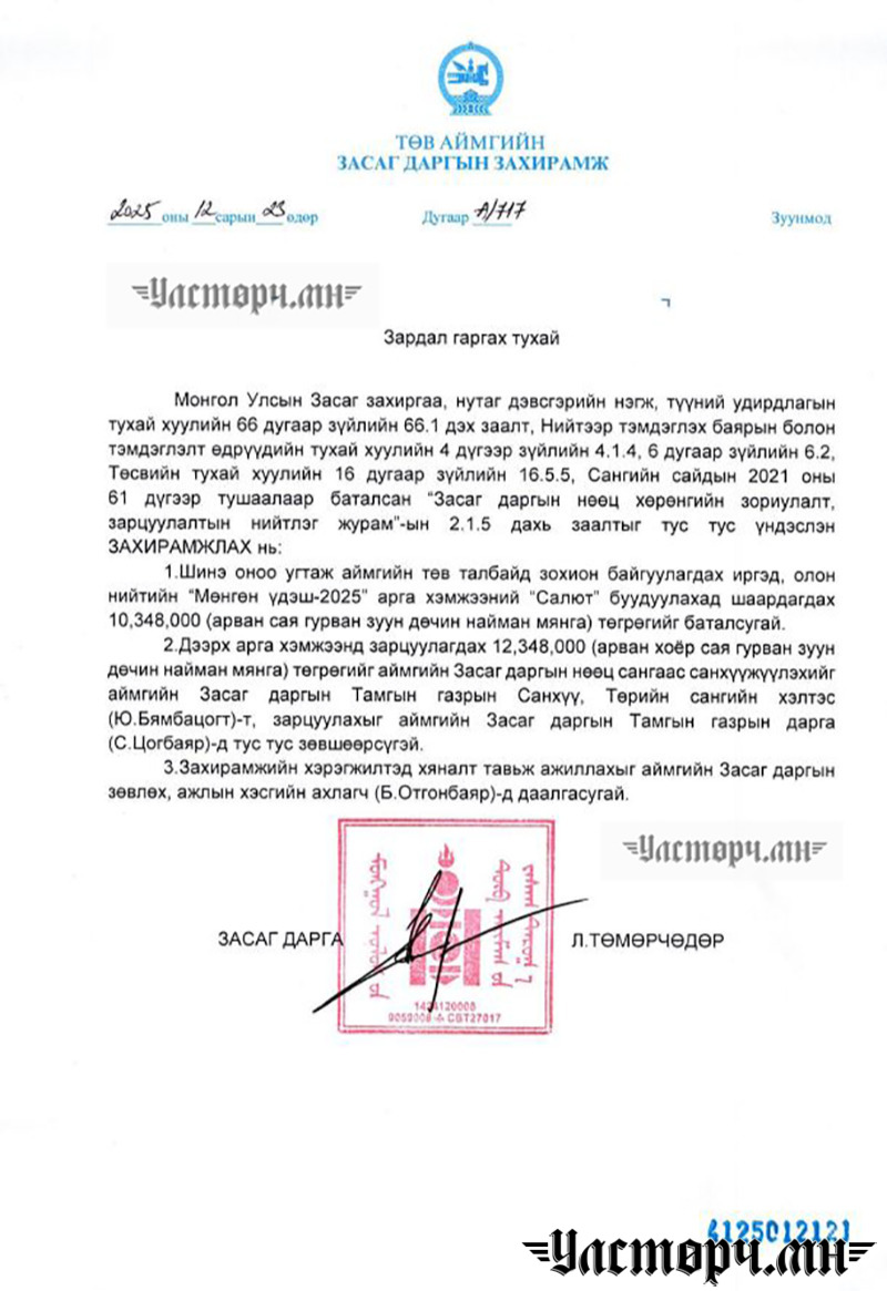 Тодруулбал, 2025 оны 12 дугаар сарын 23-ны өдрийн А/716 тоот захирамжаараа “Мөнгөн үдэш” арга хэмжээний зардал гаргах тухай гээд 25 сая 976 мянган төгрөг төсөвлөсөн байна. Түүнчлэн шинэ оноо угтаж төв талбайд “САЛЮТ БУУДУУЛАХ” гэсэн утгаар 12 сая 348 мянган төгрөгийг зарцуулсан байна. Ингэхдээ зөвхөн САЛЮТ буудуулахад 10 саяыг зарлагаджээ.