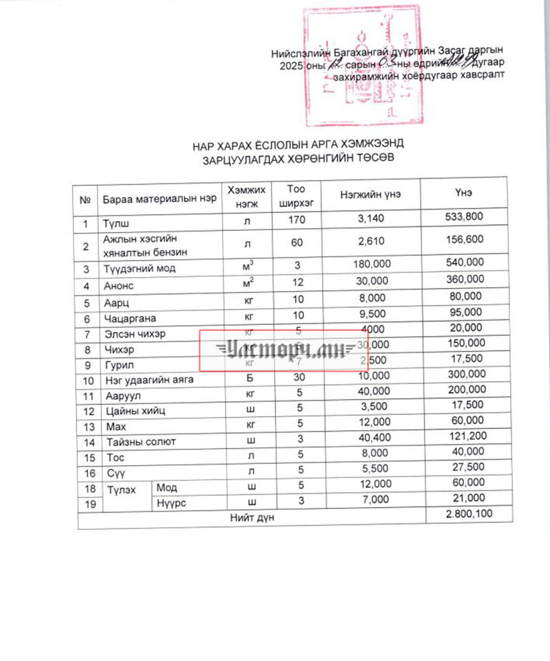Ингэхдээ төсвийн 2 сая 800 мянга 100 төгрөг зарлагадан 170 литр шатахуун, түүдэг асаах мод, аарц, чацаргана, аньс, мах, сүү тэргүүтэй бүтээгдэхүүн авсан байна.