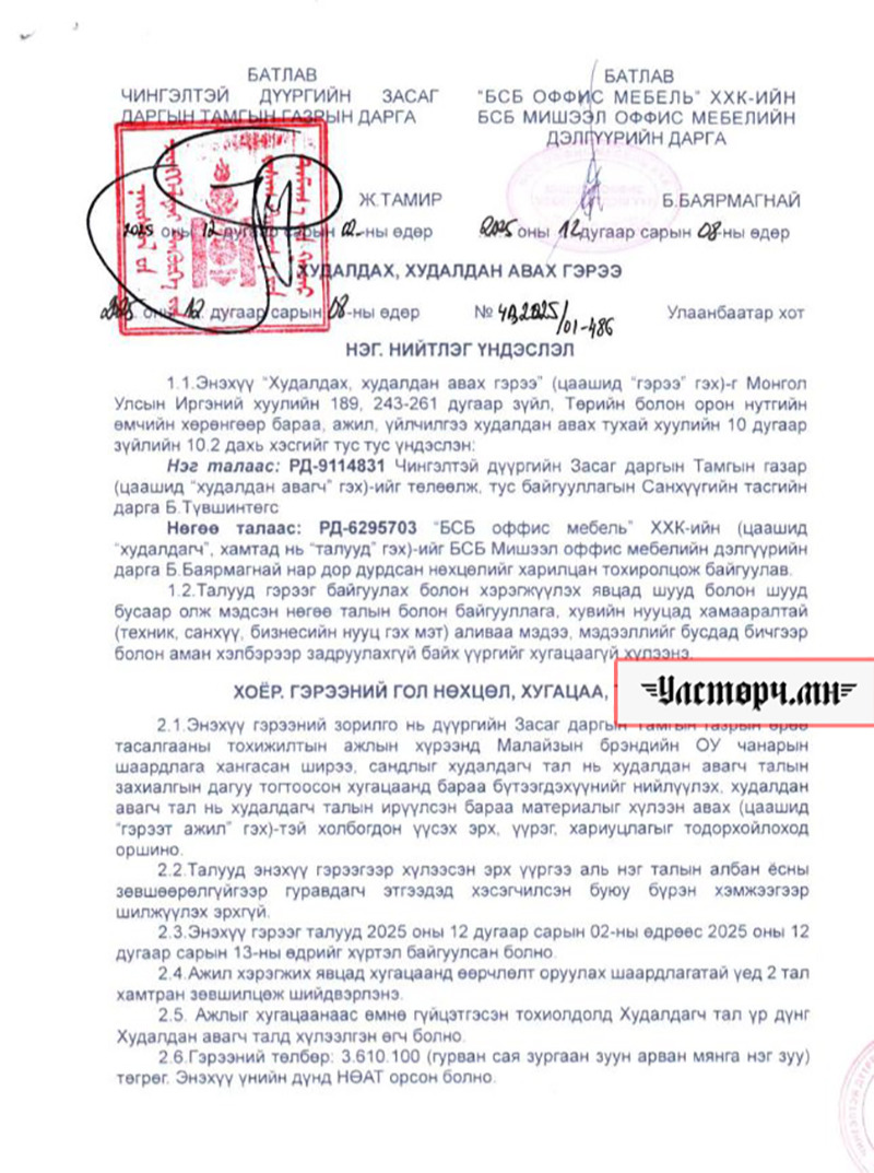 Мөн 2025 оны 12 дугаар сарын 08-нд “БСБ ОФФИС МЕБЕЛЬ” ХХК-ийн БСБ МИШЭЭЛ ОФФИС МЕБЕЛИЙН ДЭЛГҮҮРИЙН ДАРГА Б.БАЯРМАГНАЙТАЙ худалдах, худалдан авах гэрээ хийж Малайзын брэндийн ОУ-ын чанарын шаардлага хангасан ширээ сандал худалдан авчээ.