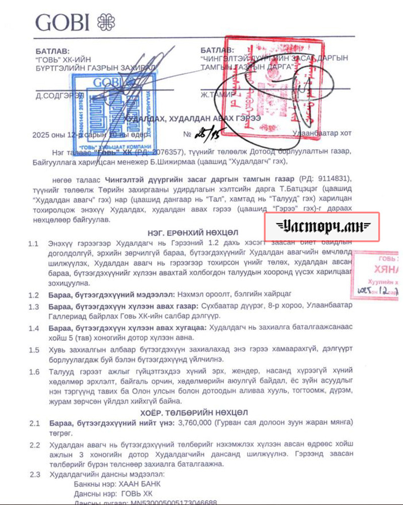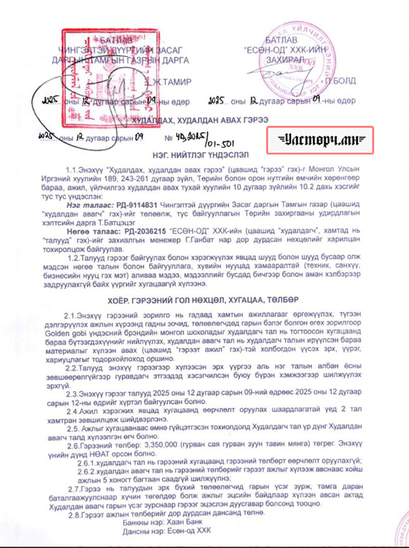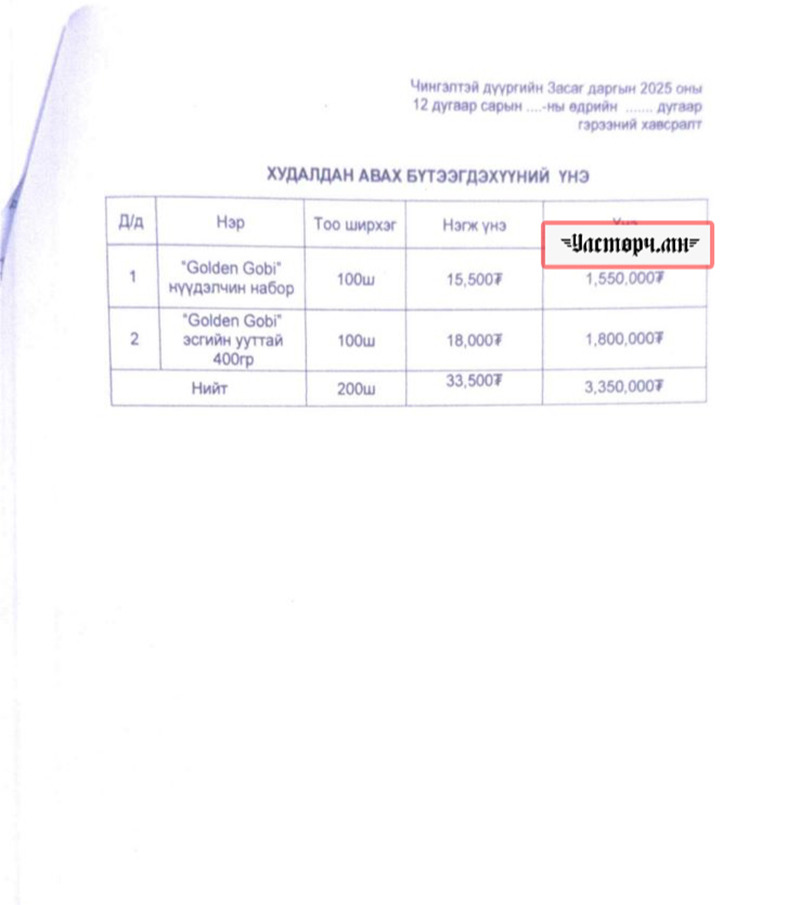 Тодруулбал, Чингэлтэй дүүргийн Засаг даргын Тамгын газрын дарга Ж.Тамир нь “Говь” ХХК-ийн бүртгэлийн газрын захирал Д.Содгэрэлтэй 2025 оны 12 дугаар сарын 10-нд худалдах, худалдан авах гэрээ байгуулж тус бүр нь 168 мянган төгрөгийн үнэтэй “Говь” брэндийн ноосон ороолт, бэлгийн хайрцаг 20 ширхэгийг авсан бол “Есөн-Од” ХХК-ийн захирал П.Болдтой 2025 оны 12 дугаар сарын 09-нд гэрээ байгуулж 100 ширхэгтэй “Golden Gobi” нүүдэлчин шоколадны набор, эсгий ууттай набор мөн 100 ширхэгийг авсан байна.