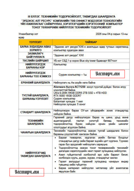 Эрдэнэс алт ресурс ХХК-ийн захирал Э.Ууганбаяр өмнө нь төсвийн мөнгөөр гэр бүлээрээ зугаалж, амралтын газар сургалтад хамрагдсан санхүүгийн баримт ил болсон тухай мэдээлэл байдаг. Тэгвэл энэ оны 4-р сарын 13-ны өдөр 25'000'000 төгрөгөөр нэг ширхэг компьютер худалдаж авах тендерийг түүний удирддаг "Эрдэнэс алт ресурс" ХХК зарлажээ.