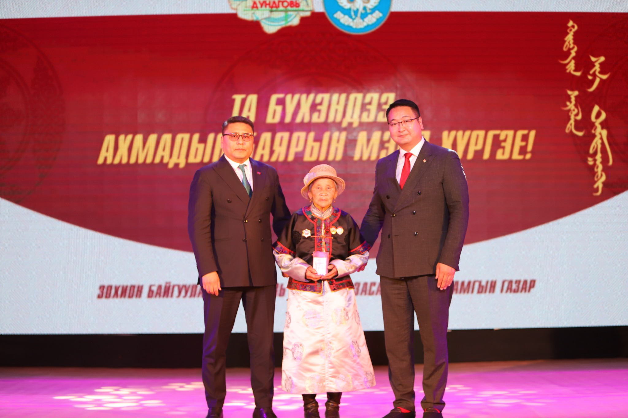 Дундговь аймгийн засаг дарга С.Мөнхчулуун Дэлгэрцогт сумын өндөр настан Г.СҮРЭНЖАВТ "Алтан гадас" одон гардуулж өглөө