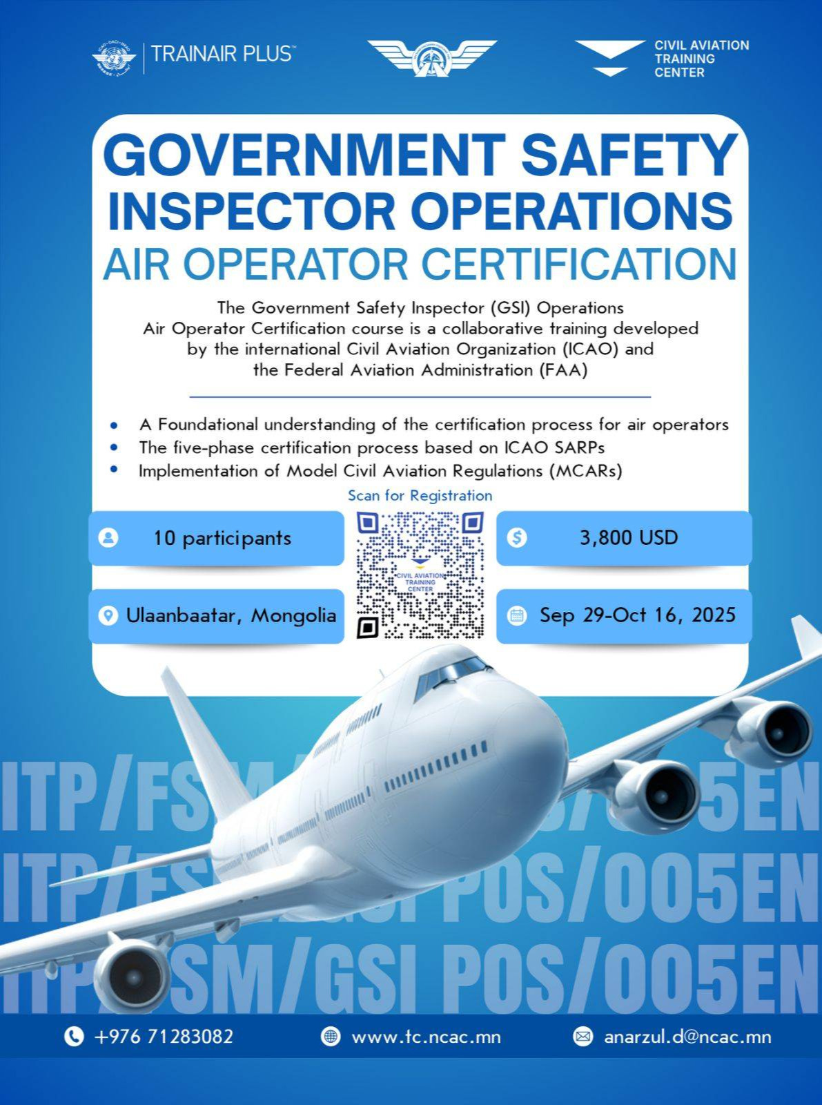 Олон улсын иргэний нисэхийн байгууллага (ICAO)-ын TRAINAIR PLUS хөтөлбөрийн хүрээнд 2025 оны 09 дүгээр сарын 29-ний өдрөөс 10 дугаар сарын 16-ны өдрүүдэд Government Safety Inspector (GSI) Operations – Air Operator Certification ITP/FSM/GSI OPS/005EN сургалт Монгол улсад анх удаа зохион байгуулагдах гэж байна.