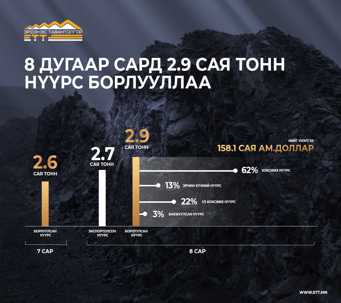 ЭТТ: “ЭРДЭНЭС ТАВАНТОЛГОЙ” ХК 11 ДҮГЭЭР САРД 2.4 САЯ ТОНН НҮҮРС БОРЛУУЛЖ, 3.4 САЯ ТОНН НҮҮРС АЧЛАА