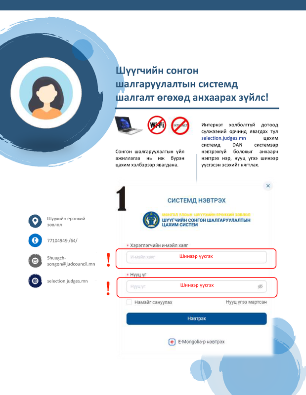 Шүүгчийн сонгон шалгаруулалтын хууль зүйн мэдлэг, чадварын шалгалт 11 дүгээр сарын 04-нд эхэлнэ. Шалгалтыг Шүүхийн ерөнхий зөвлөлийн байранд selection.judges.mn цахим системээр авах юм. Шалгалтын өдөр selection.judges.mn системд нэвтрэхэд "Дан" системээр дамжих боломжгүй тул нэвтрэх нэр, нууц үгээ шинээр үүсгэн мартахааргүй байхаар хувийн зохион байгуулалтаа хангахыг хүсье!