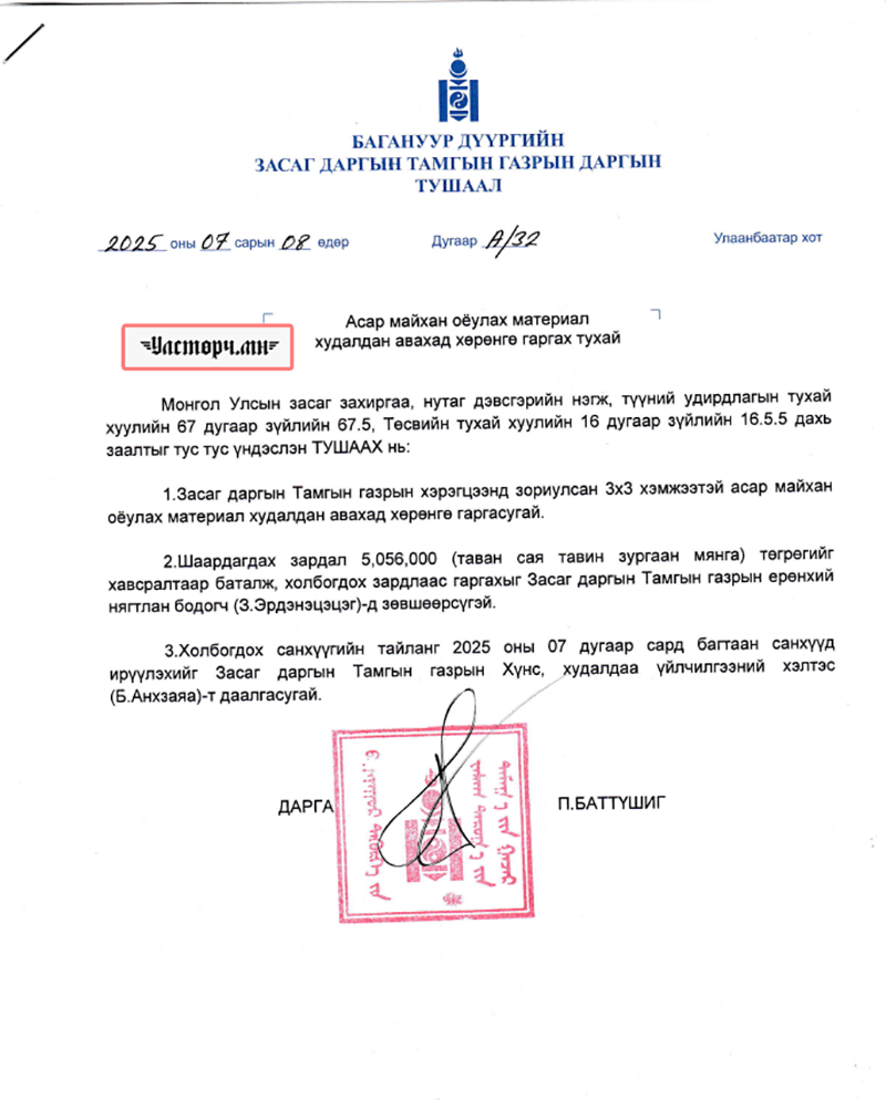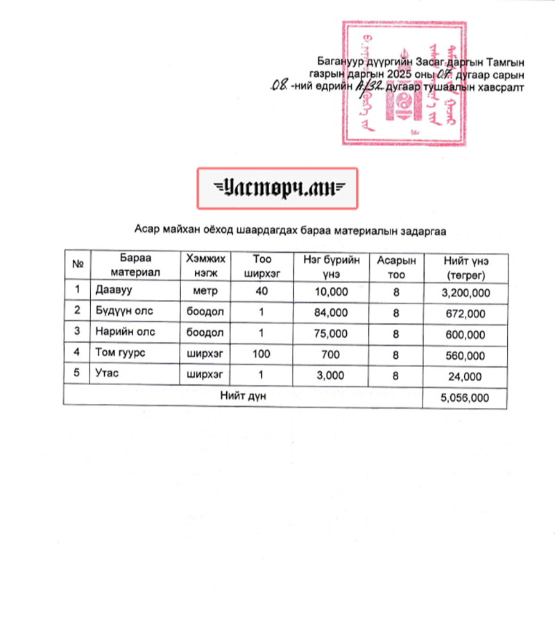 Түүнчлэн татвар төлөгчдийн мөнгөөр 2025 оны 07 дугаар сарын 08-нд 3x3 хэмжээтэй АСАР МАЙХАН ХИЙЛГЭХЭД 5 сая 56 ямнган төгрөг зарцуулжээ.