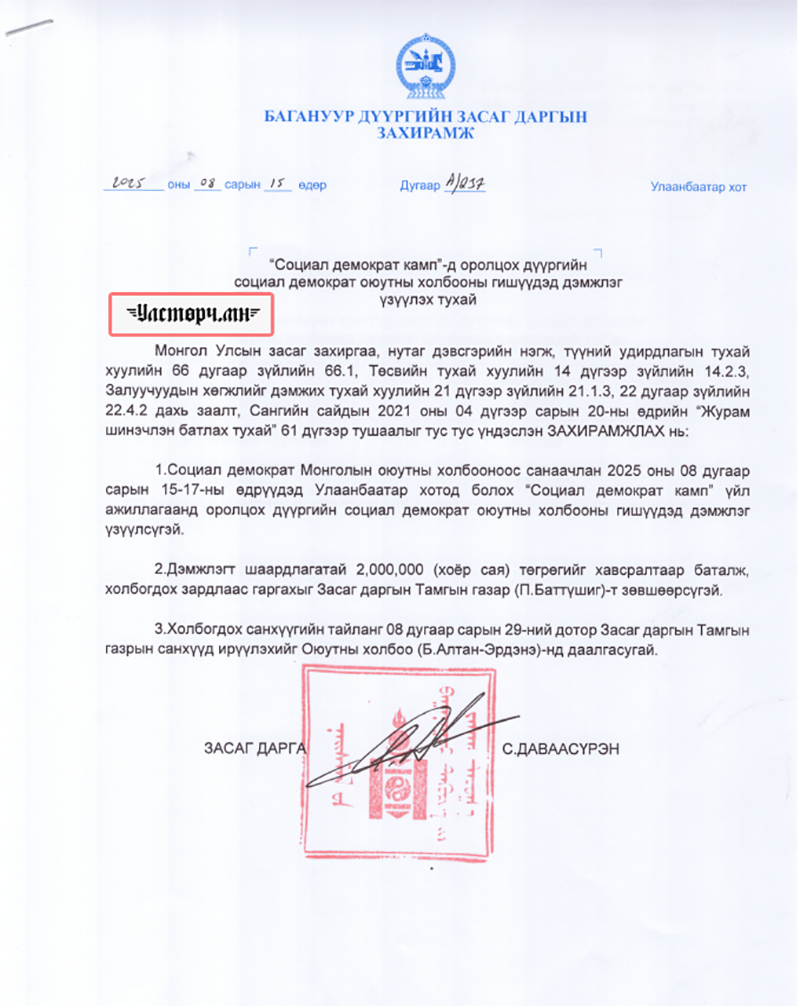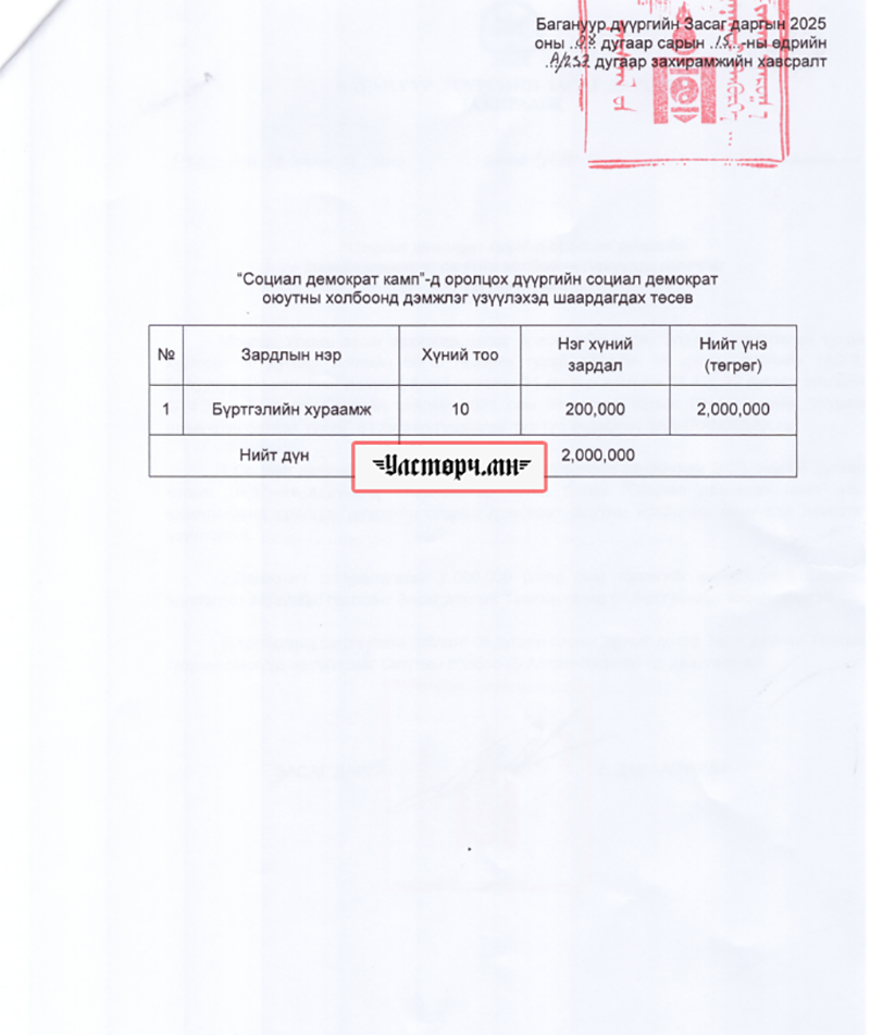 Төсвийн тухай хуульд 6.4.2.төрийн болон орон нутгийн чиг үүрэгт хамаарахгүй хөтөлбөр, арга хэмжээг санхүүжүүлэхгүй байх; 6.4.6.хуульд өөрөөр заагаагүй бол төсвийн орлогыг аль нэг этгээд, эсхүл үйл ажиллагаанд тусгайлан оноохгүй байх зэрэг заалтыг зөрчихгүй байх ёстой. Гэтэл нийслэлийн Багануур дүүргийн Засаг дарга С.ДАВААСҮРЭН 2025 оны 08 дугаар сарын 15-нд А/237 тоот захирамжаараа дүүргийнхээ Социал демократ оюутны холбоондоо буюу өөрийн намын, өөрийг нь дэмждэг оюутан залуучууддаа ТӨСВИЙН МӨНГӨНӨӨС дэмжлэг үзүүлсэн байна.