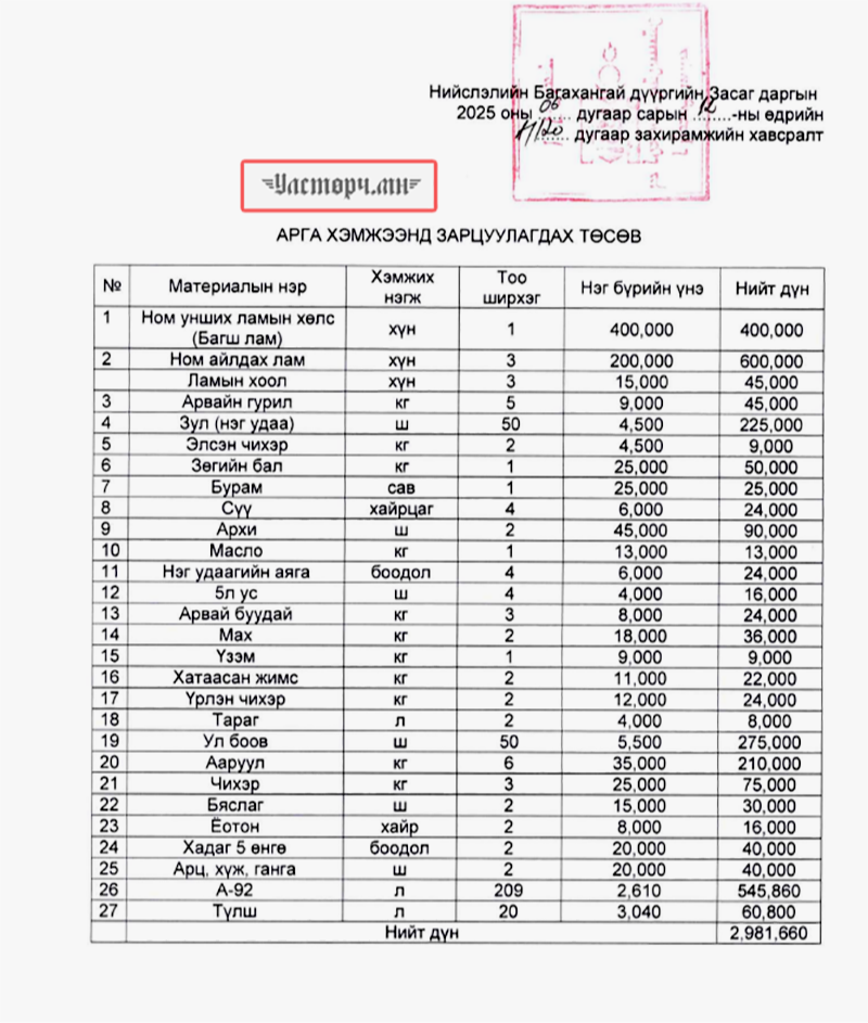Ингэхдээ дөрвөн ламаар ном уншуулж, ЛАМ БАГШДАА 400 мянган төгрөг, наад гурван ламд нь тус бүр 200 мянга, нийт НЭГ САЯ ТӨГРӨГ өгсөн байна. Арвай, буудай, арц хүж, ганга, шар тос, сүү, аяга, хоол, мах, арвайн гурил, АРХИ, зул, барам, хоол зэрэгт ТӨСВИЙН МӨНГИЙГ ЗАРЦУУЛЖЭЭ.