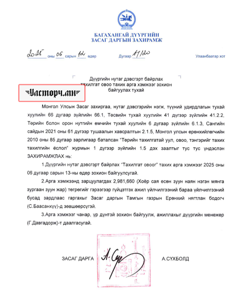 Уг журмын НЭГДҮГЭЭР БҮЛЭГ нь ганцхан заалттай атал А.Сүхболд дарга 1,5 дахь заалт гэж байхгүй зүйл заалтыг захирамждаа үндэслэсэн байна.