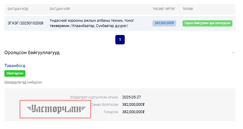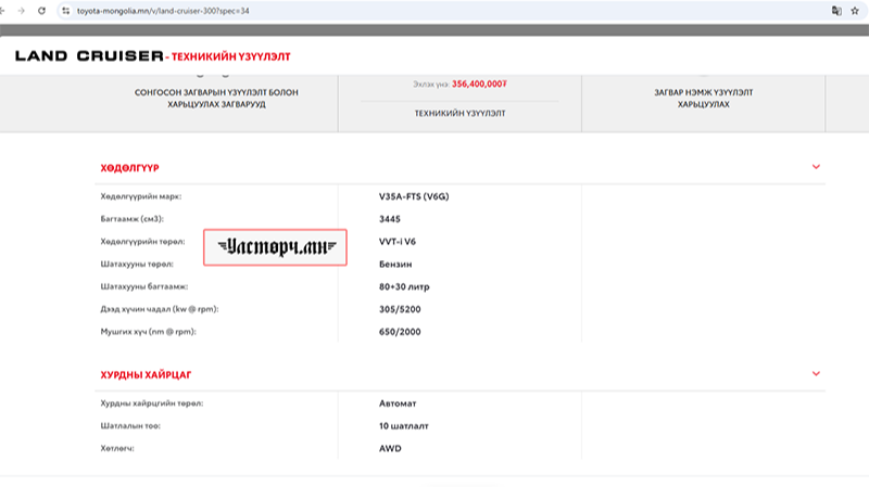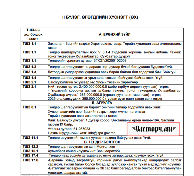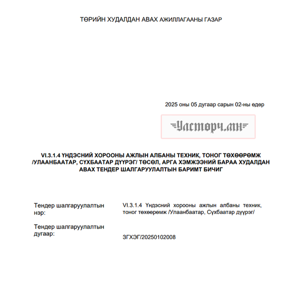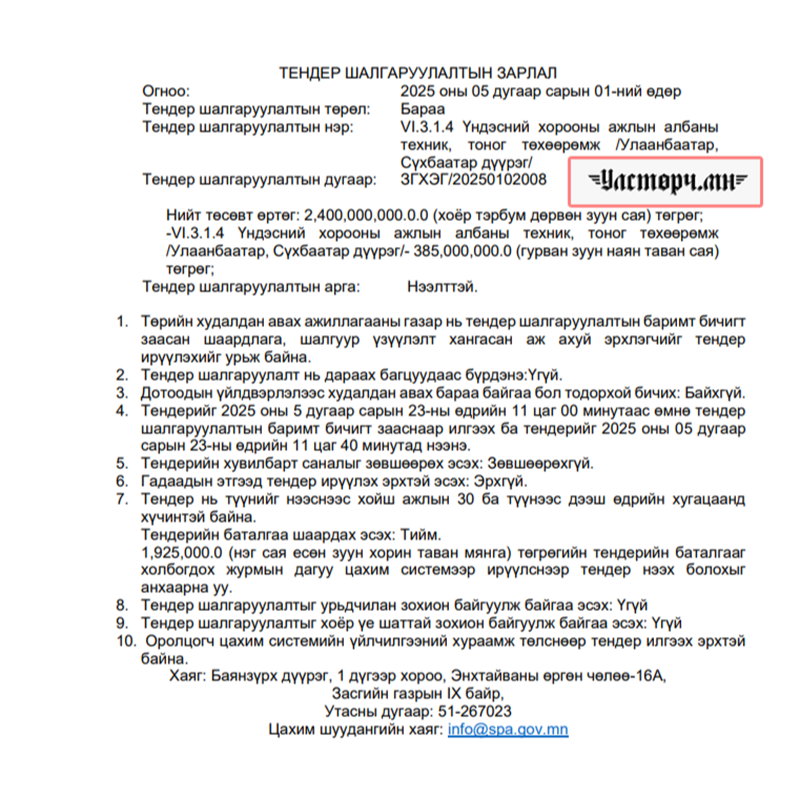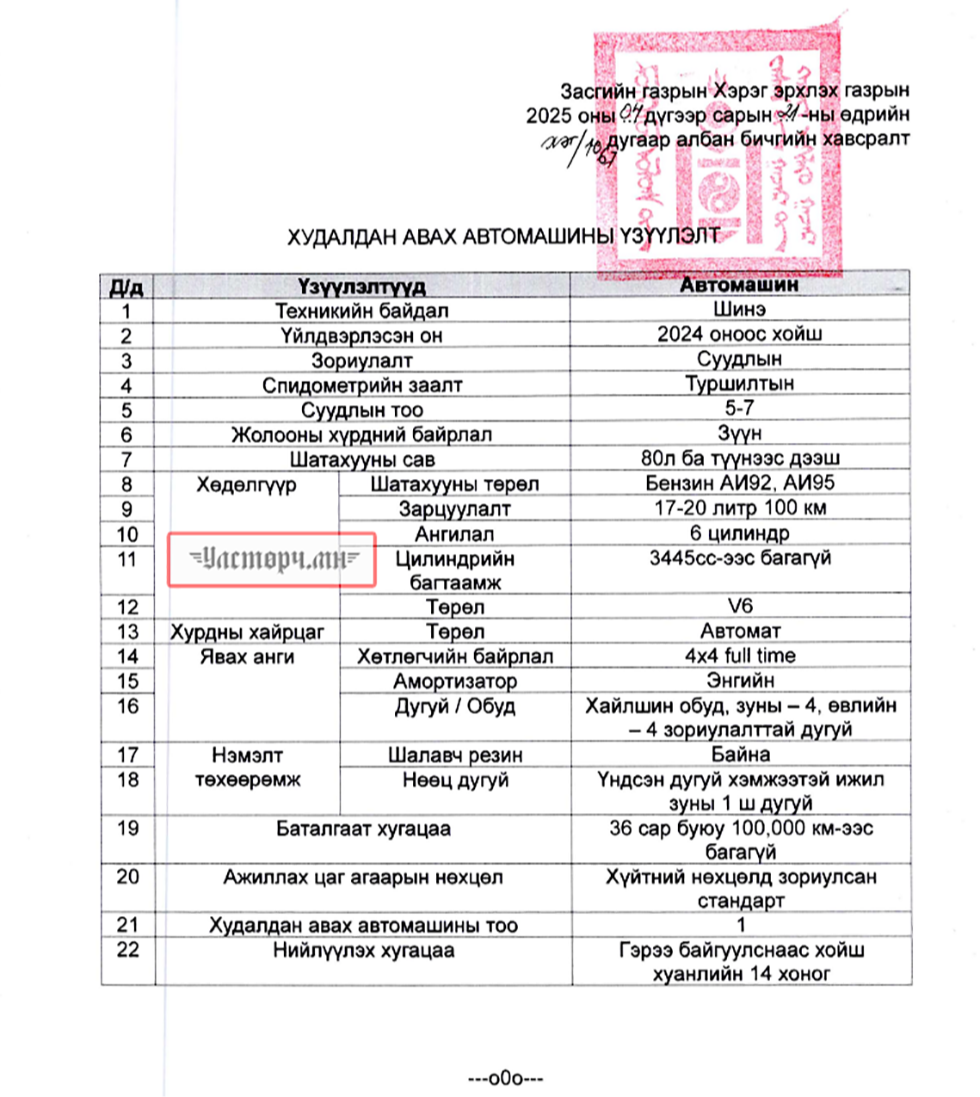 Зуднаар нохой зоолно гэж үгтэй. Яг түүн шиг Засаг төрийн зодоон дундуур Сүхбаатар дүүрэгт байрлан үйл ажиллгаа явуулдаг ямар нэг Үндэсний хорооны дарга шинэ машин авна гэсэн байна. Нийт 2,4 тэрбумын төсөвт өртөгтэй тендерээс 385 саяар АВТОМАШИН АВАХ багц тендер зарлаж, улмаар Таванбогд компаниас 2025 оны 05 дугаар сарын 27-нд 382 саяар шинэ ЛАНД-300 авчээ. Ланд-300 гэсний учир нь тухайн зарласан тендерийн техникийн тодорхойлолтод заасан үзүүлэлт болох 2024 оноос хойш үйлдвэрлэгдсэн, 5-7 хүний суудалтай, зүүн талдаа жолооны хүрдтэй, 80л-с их бензин зарцуулдаг, 100км зайд 17-20л бензин иддэг, 6 цилиндртэй, 3445-с ихгүй цилиндрийн багтаамжтай, 4х4 Full time-тай, автомат байх зэрэг шаардлагад нь “Toyota-Mongolia.mn” сайтад байршуулан зардаг “Таванбогд моторс” ХХК-ийн 2025 оны шинэ загварын 350 саяас дээш үнэтэй Land Criuser 300 автомашины үзүүлэлтүүдтэй нийцэж байна.