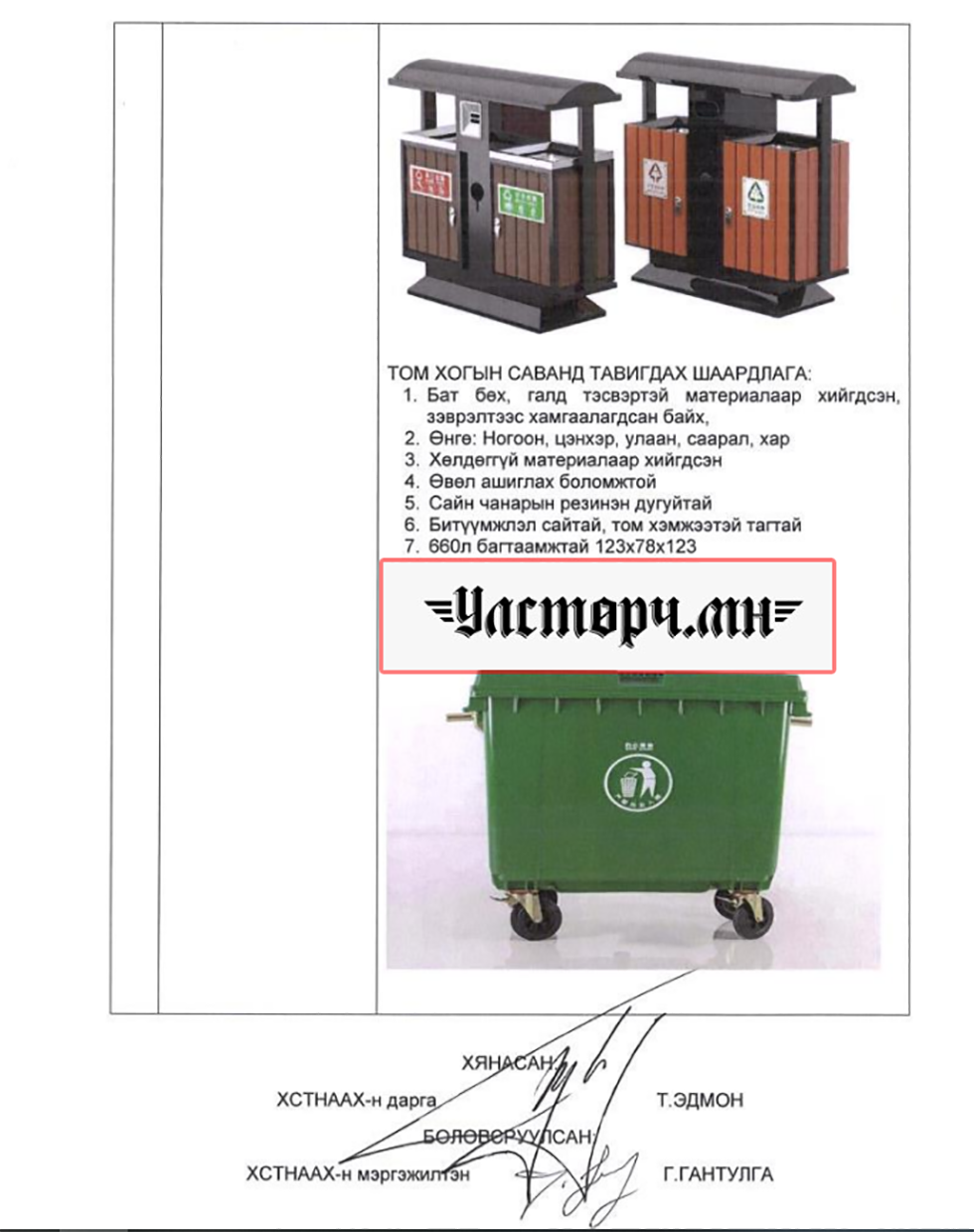 Дээрх мөнгөөр 350 ширхэг сандал, 350 ширхэг жижиг хогийн сав, 450 ширхэг ТОМ хогийн сав авна гэсэн байсан ч хаана ямар байршилд тараагдсан нь мэдэгдэхгүй алга болжээ.