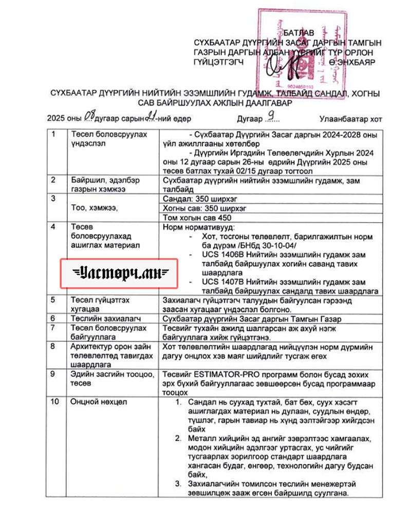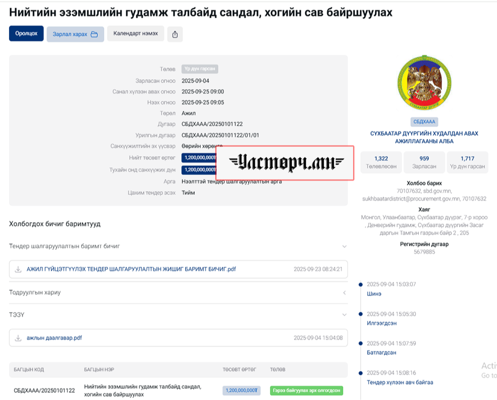 Татвар төлөгчдийн мөнгөөр АРХИ ХУДАЛДАН АВЧ “Улаанбаатар зочид буудал”-д найрлаж 60 жилийн ойгоо тэмдэглэсэн Сүхбаатар дүүргийн удирдлагууд 1,2 тэрбумаар ХОГИЙН САВ, САНДАЛ хийлгэж дүүргийнхээ өнгө үзэмжийг сайжруулна гэж 2025 оны 09 дүгээр сарын 04-нд тендер зарлаж, 25-нд шалгаруулжээ.