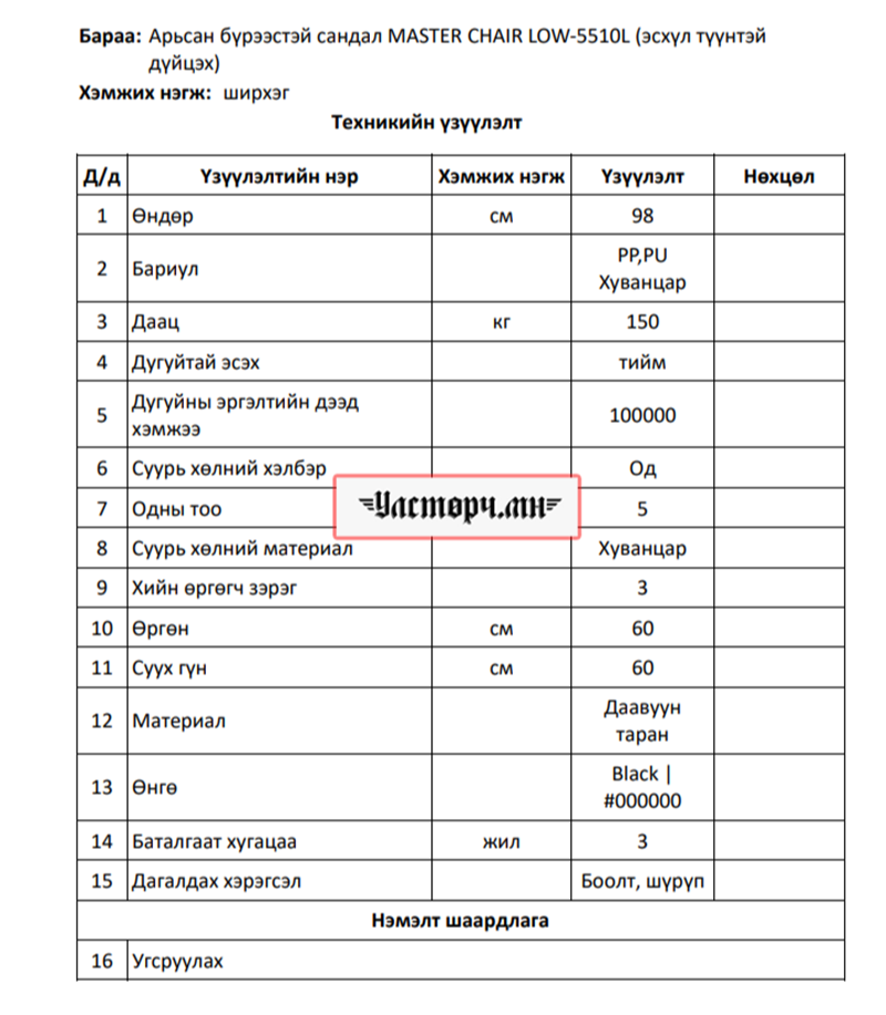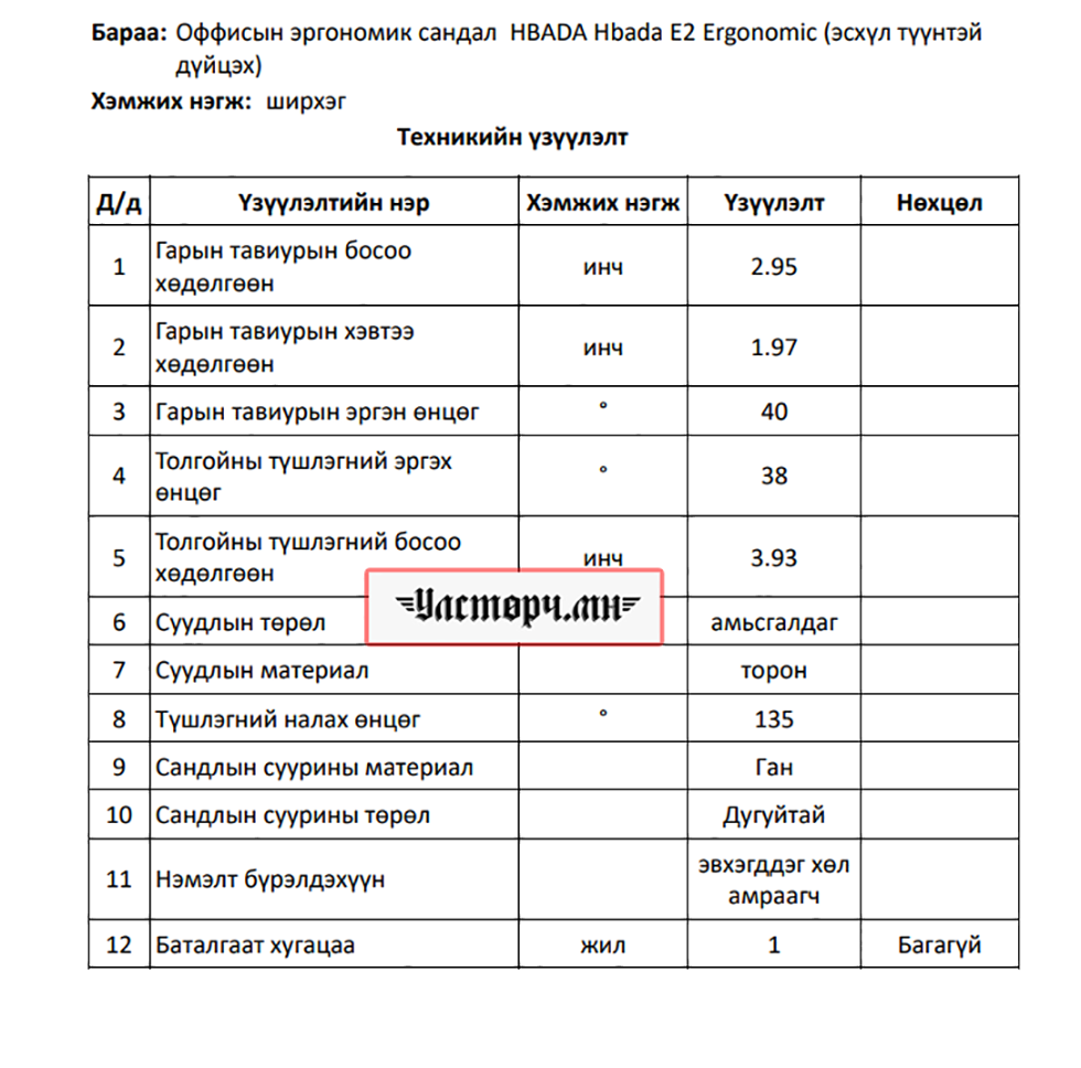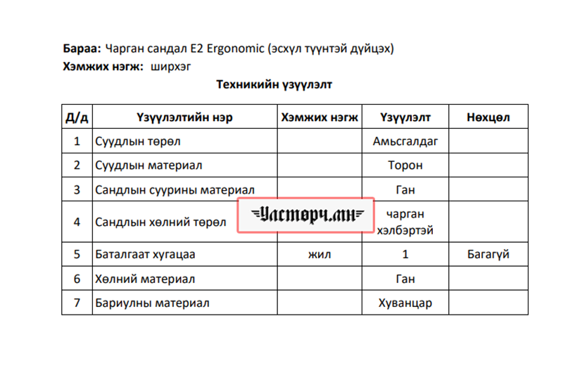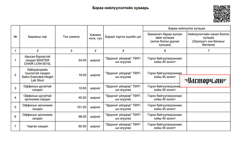 Уг тендерт “ЧАРГАН САНДАЛ” 60 ширхэг, “Оффисын эргономик сандал” 199 ширхэг, “Арьсан бүрээстэй мстер сандал” 54 ширхэг, Оффисын дугуйтай сандал 50 ширхэг, лабароторийн түшлэггүй сандал 19 ширхэгийг авч, “Эрдэнэт үйлдвэр” ТӨҮГ-ын агуулхад хураана гэжээ.