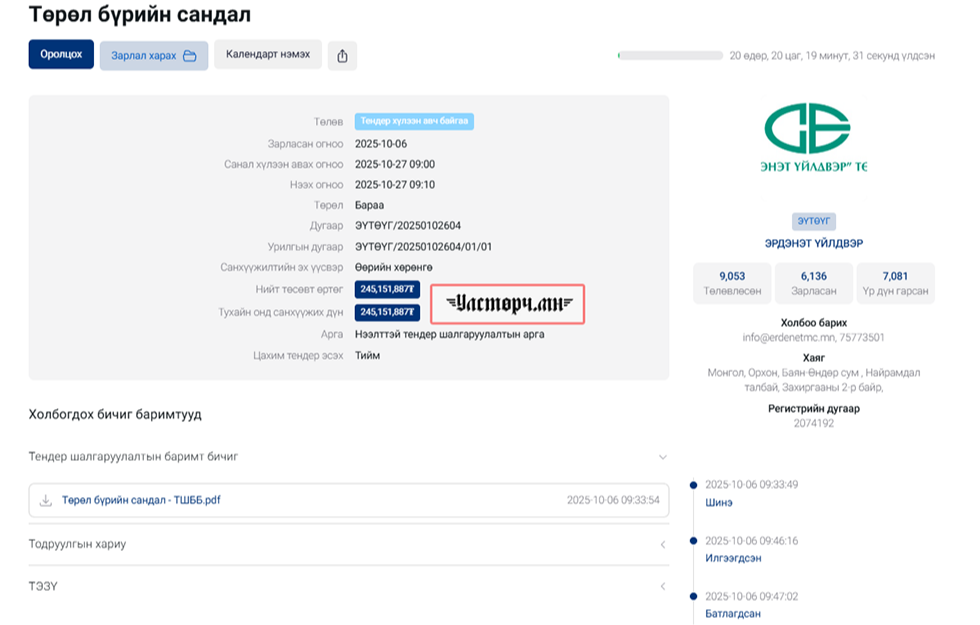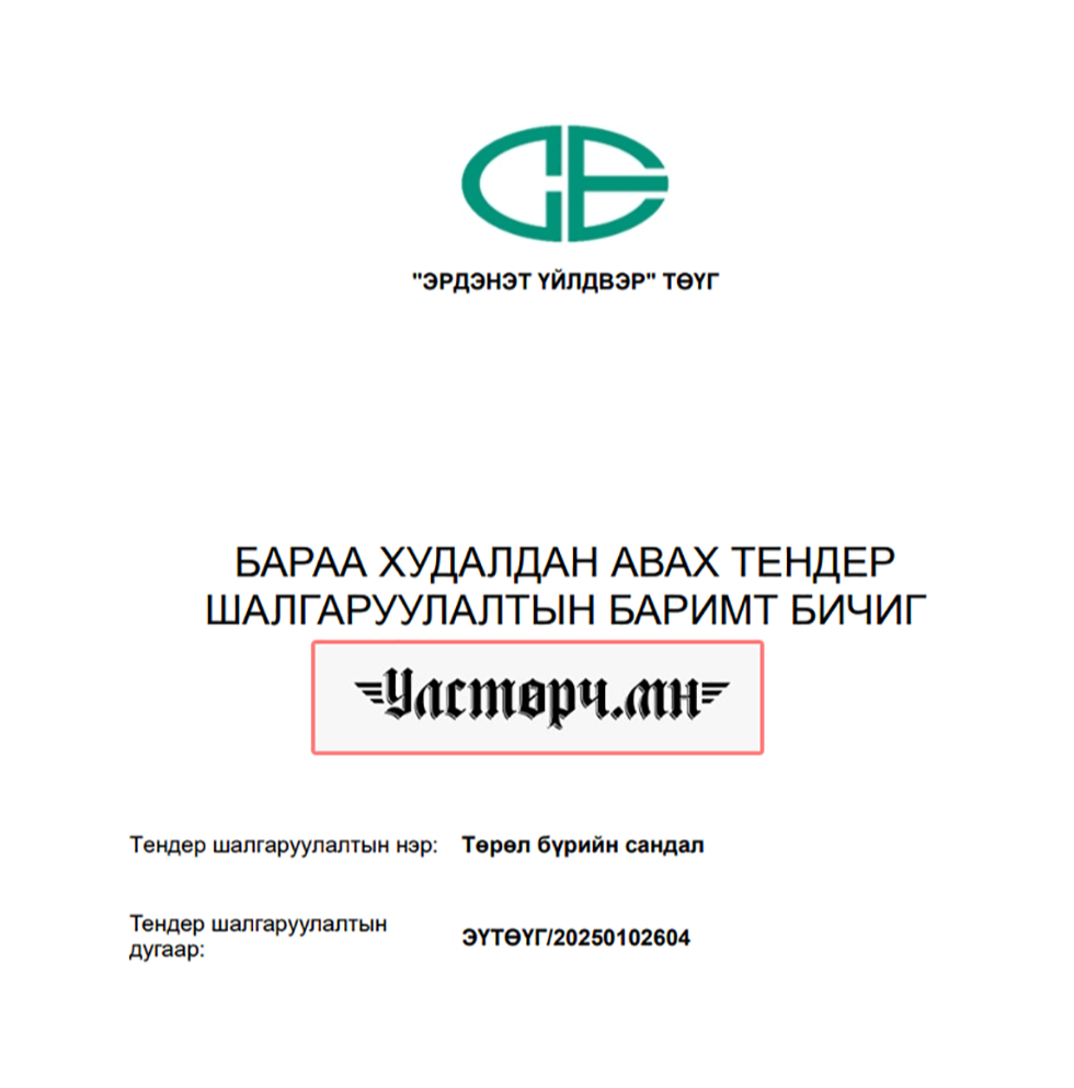 Ажлын байрандаа авлига авч баригдан шалгагдаж байсан нөхөрт төрийн хуулийг уландаа гишгэх ч энүүхэнд байлгүй яахав. Тэд 2025 оны 10 дугаар сарын 06-нд “ТӨРӨЛ БҮРИЙН САНДАЛ” авах гэсэн утгаар 245 сая 151 мянган төгрөгийн тендер зарлажээ.