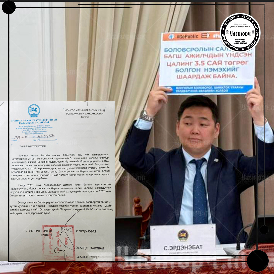 УИХ-ын гишүүн С.ЭРДЭНЭБАТЫН санаачилсан Боловсролын жил багш ажилчдынхаа цалин хөлсийг нэмэх зарчмын саналыг дэмжиж 42 гишүүн зуржээ.