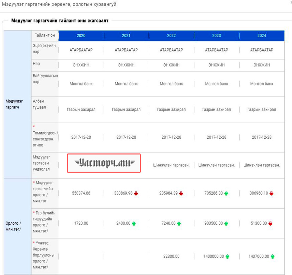 Төрд ажиллаад ТЭРБУМТАН БОЛОХ ямар ч боломжгүй гэдгийг Монголын өнөөгийн нийгэм, цалингийн тогтолцоо илт харуулна. Монголбанкны газрын захирал байлаа гээд ТЭРБУМТАН болтлоо томрох боломжгүй атал А.ЭНХЖИН захирал ямар аргаар БАЯЖСАН нь анхаарал татна. Тэрбээр 2023 онд 705 сая 286 мянган төгрөгийн орлоготой байсан бол 2024 онд 306 саяыг олдог болтлоо навс унажээ. Гэр бүлийнхэн нь 903 саяын орлого олдог байснаа 2024 онд 51 сая 300 болтлоо ЯДУУРЧЭЭ. 2023 онд 1 тэрбум 400 саяын хөрөнгө борлуулсан бол 2024 онд 1 тэрбум 437 саяын борлуулалт хийсэн байна.