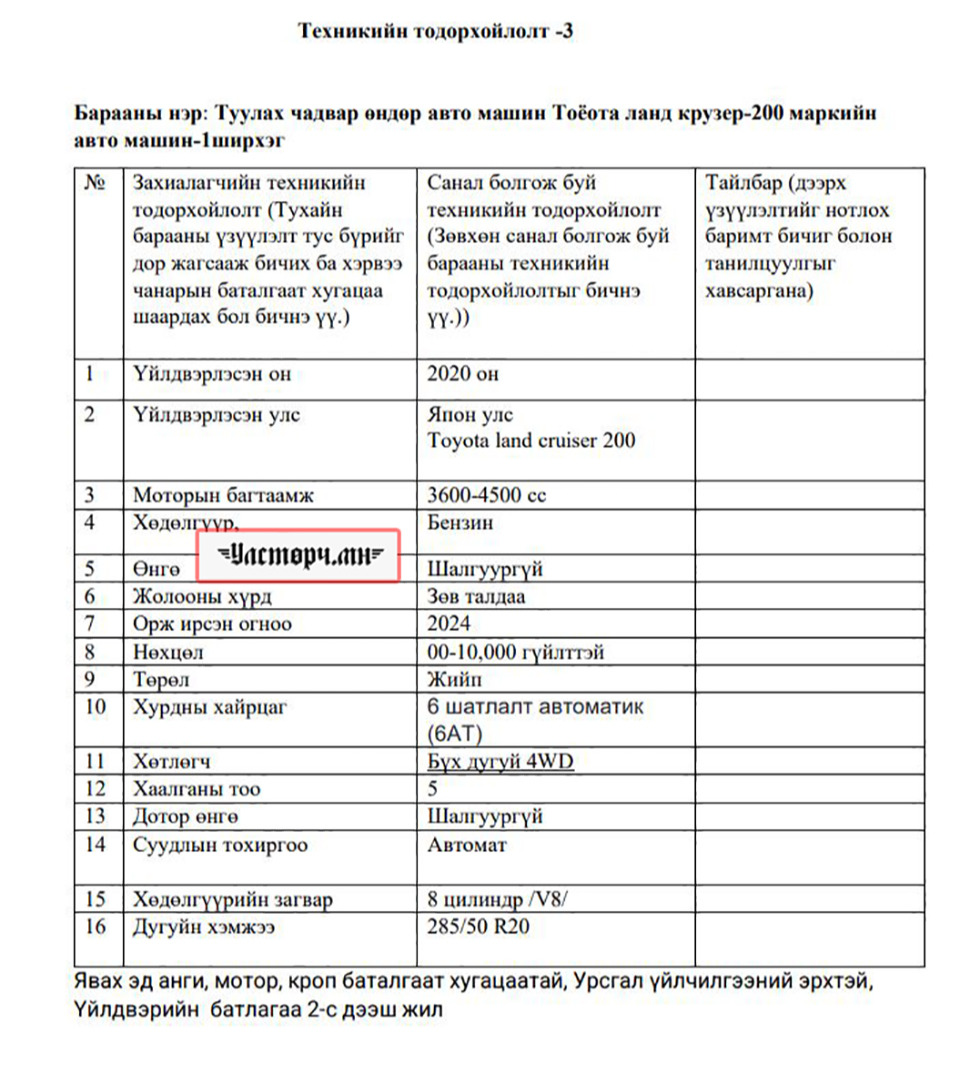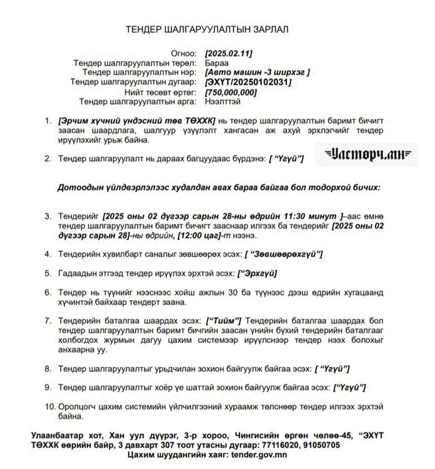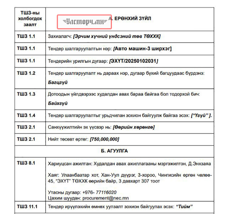 Эрчим хүчний яамныхан энэ мөнгийг ТУУЛАХ ЧАДВАР САЙТАЙ АВТОМАШИН буюу ОН ЗАЛУУТАЙ ЖИЙП болгон ашигласан байж болзошгүй нь. Тодруулбал, “Эрчим хүчний үндэсний төв” ТӨХХК-иас 750 сая төгрөгөөр “Авто машин -3 ширхэг” гэх утгаар тендер зарлажээ.