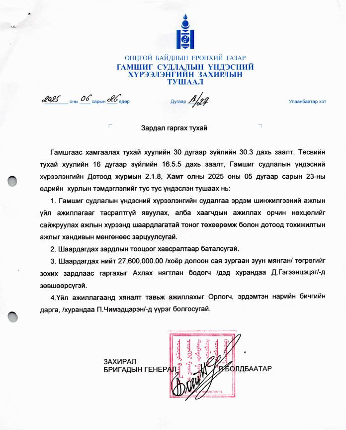 Сэтгэлтэй, аврагч нараа, хамт олноо гэдэг хүн бол “ОНЦГОЙ ХОТХОН”-ны маргааныг эцэслэж, гал сөнөөгч нараа орох оронтой, оочих аягатай, өмсөх хувцастай болгох санаачилга дэвшүүлэх ёстой. Гэтэл чөлөөндөө суусан ч албан тушаалд “СҮНС НЬ ХОРГОДСОН” Л.БОЛДБААТАР генерал ажилчдынхаа эрх ашгийн төлөө бус өөрийнхөө ая тухтай байдлын төлөө тушаал гаргаж ШИРЭЭНИЙ ДАВЦАН СОЛИХ, САНДАЛ АВАХ, КОФЕНЫ МАШИН, ХӨРГӨГЧ зэргээр ажлын байраа чимжээ. Эрхэм генералаа АЛБА ХААГЧДИЙН чинь амь нас чухал уу, алд биений чинь АЯ ТУХ, эрх мэдэл чинь чухал уу...