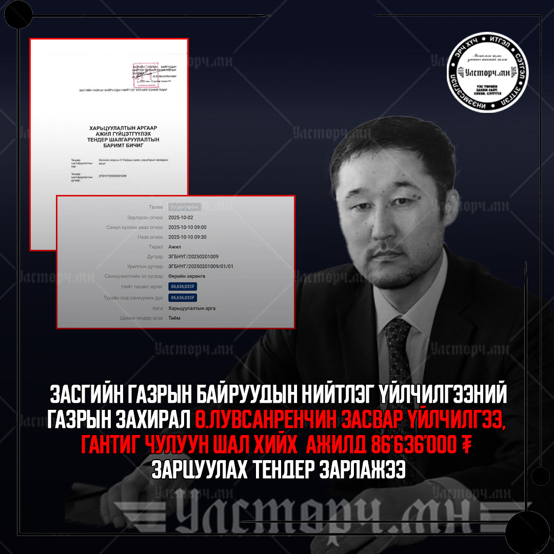 ЗГ-ын байруудын нийтлэг үйлчилгээний газрын захирал Ө.ЛУВСАНРЕНЧИН засвар үйлчилгээ, гантиг чулуу шал хийх ажилд 86 САЯ төгрөгийг зарцуулах тендер зарлажээ