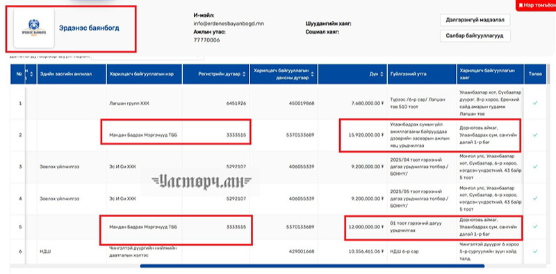 Түүнчлэн Дорноговь аймгийн Улаанбадрах сумын Сангийн далай 1-р багт байрлах байрны засвар гэсэн утгаар “Мандан бадрах мэргэчүүд” ТББ-ын 5370133689 тоот данс руу 27 сая 920 мянган төгрөгийг 01 тоот гэрээний дагуу урьдчилгаа гэсэн утгаар шилжүүлсэн байна. Мөн дээрх ТББ руу “НИЙГМИЙН ХАРИУЦЛАГА” гэсэн эдийн засгийн ангилалаар 12 сая төгрөгийг наадмын үеэр шилжүүлсэн байна.