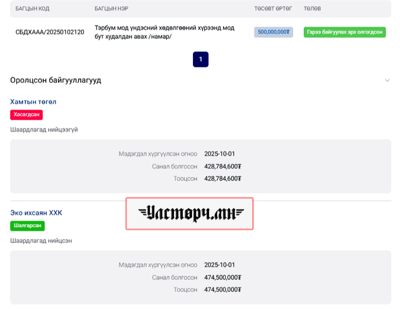 Хар шороо, элс, хайлаас, шар хуайс авах ХАГАС ТЭРБУМЫН үнэтэй тендерт 2025 оны 10 дугаар сарын 01-ний өдөр “ЭКО ИХСАЯН” ХХК 474 сая 500 мянган төгрөгийн үнийн дүнгээр шалгарсан байна.