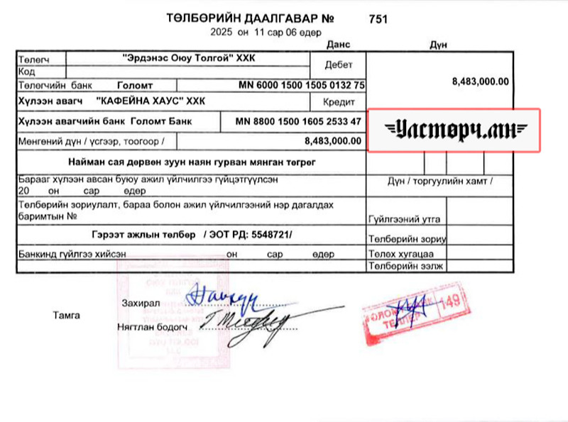 Тэгвэл өнгрсөн амралтын өдөр буюу 2025 оны 11 дүгээр сарын 06-нд компанийнхаа Голомт банкны MN6000 1500 1505013275 тоот данснаасаа “КАФЭЙНА ХАУС” ХХК-ийн данс руу 8 сая 483 мянган төгрөгийг шилжүүлсэн байна.