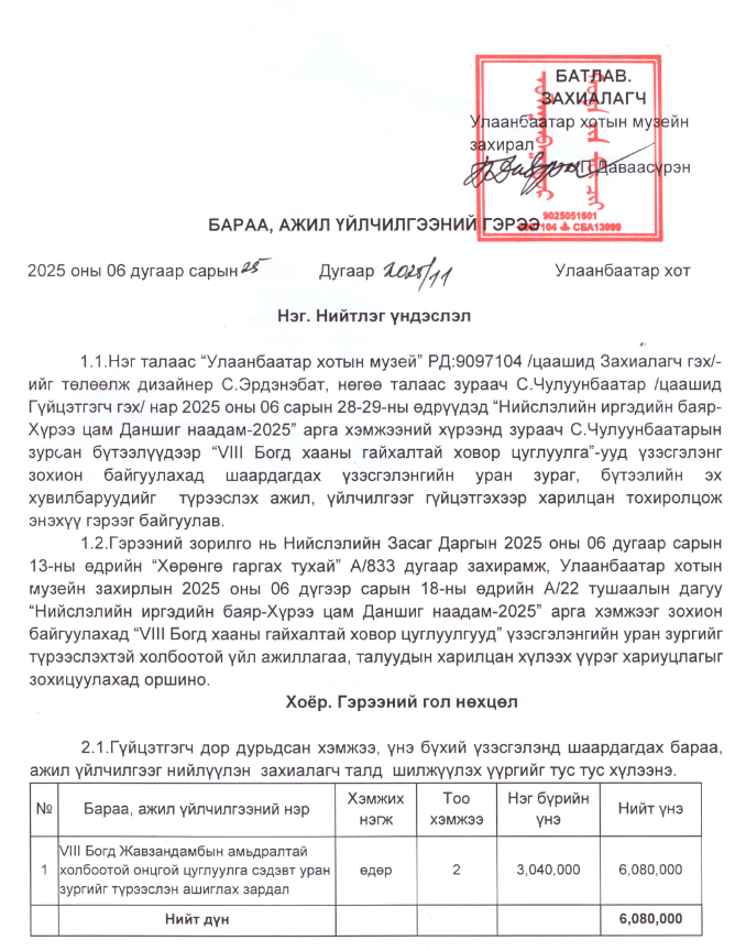 Улаанбаатар хотын музейн дарга П.ДАВААСҮРЭН дарга 12 САЯАР ГЭР ТҮРЭЭСЛЭЖ, 6 САЯАР зураг өлгөжээ