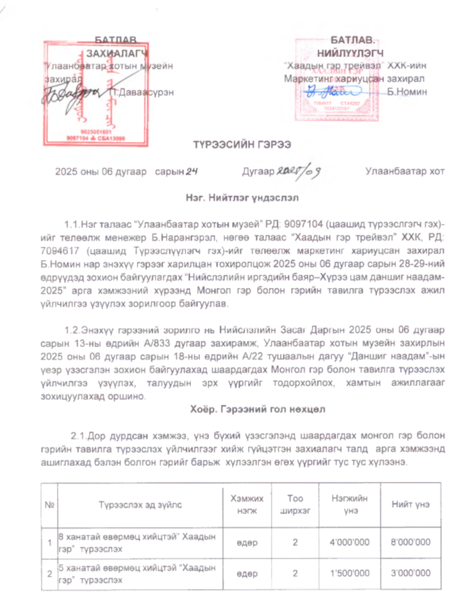 ингэхдээ Хаадын гэр трейвэл ХХК-ын 32 сая төгрөгөөр борлуулдаг 8 ханатай гэрийг 2 өдөр 8 саяар, 13 саяар борлуулдаг 5 ханатай гэрийг 2 өдөр 3 саяар түрээслэжээ. Мөн Хүрээ цам Даншиг наадам-2025” арга хэмжээг зохион байгуулахад 6 сая төгрөг зарцуулжээ.