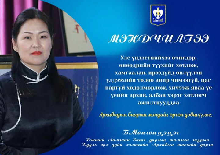 Улс үндэстнийхээ өчигдөр, өнөөдрийн түүхийг хөтлөж, хамгаалан, ирээдүйд өвлүүлэн үлдээхийн төлөө анир чимээгүй, цаг наргүй хөдөлмөрлөж, хичээж яваа үе үеийн архив, албан хэрэг хөтлөгч ажилтнууддаа Архивчдын баярын мэндийг өргөн дэвшүүлье