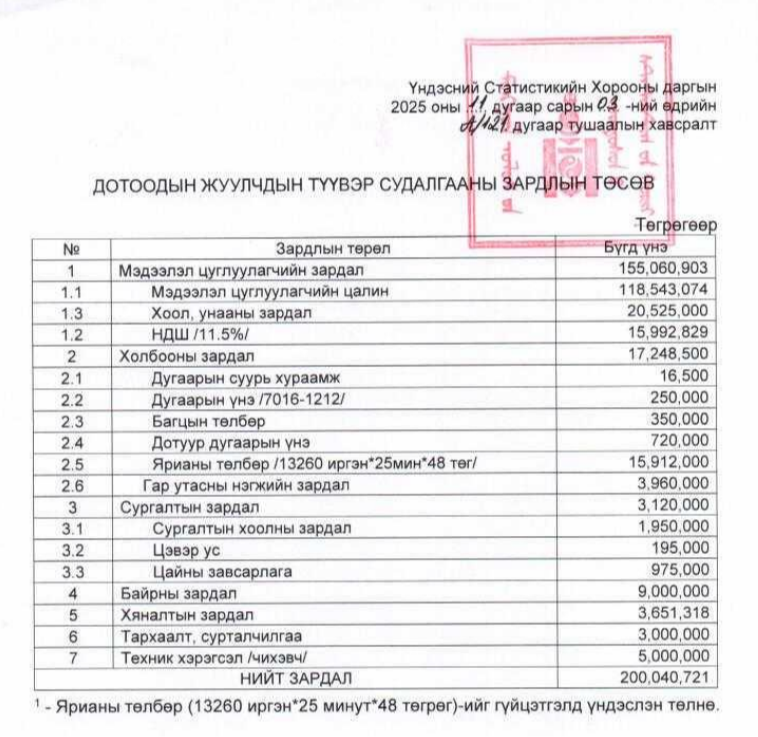 ҮСХ-ны энгийн нэгэн жишээг ухаж үзэхэд 2025 оны 11 сард "Дотоодын жуулчдын түүвэр судалгаа"-г 200 сая төгрөгөөр хийжээ.