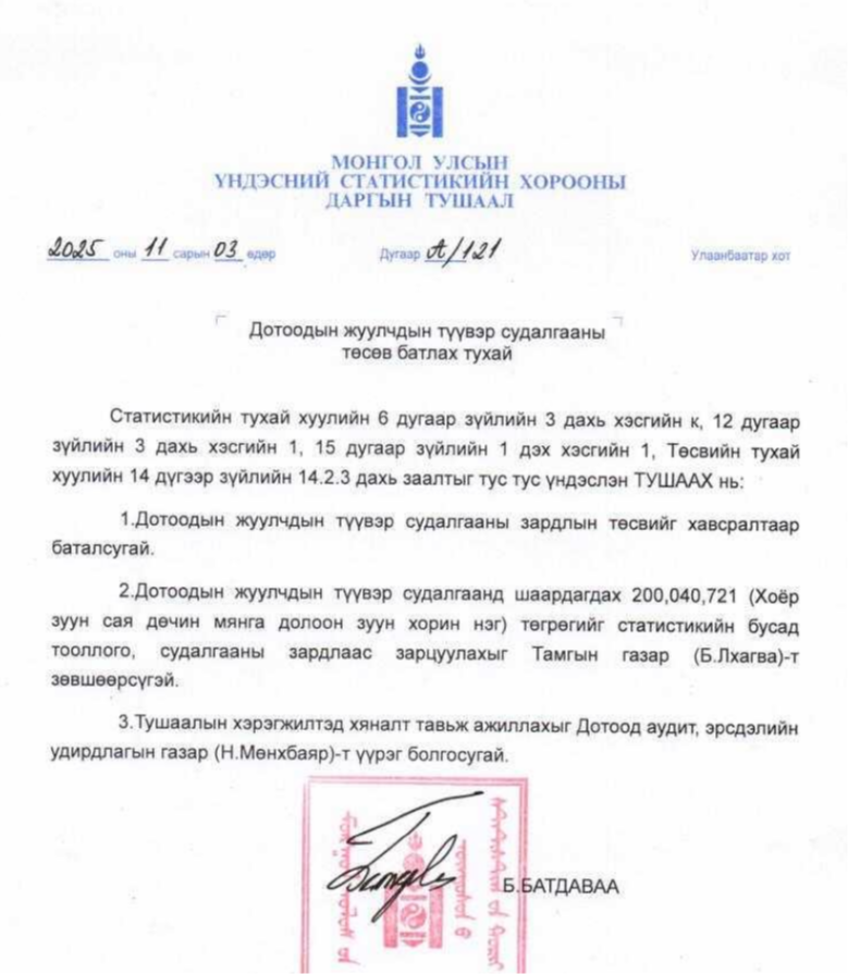 Иргэдийн амьдралд хэрэггүй "СУДАЛГАА" нэрээр төсвийн мөнгө халаасалж суудаг, сүржин нэртэй газар бол Үндэсний статистикийн хороо. Энэ газрын даргаар Б.Батдаваа ажилладаг. Түүний эхнэр Ц.Амгалангийн хамаарал бүхий найман компани 1.1 сая тонн буюу 3.7 их наяд орчим төгрөгтэй дүйцэх нүүрс гаалийн бүрдүүлэлтгүй гаргасан шалгагдах учиртай субьект билээ.