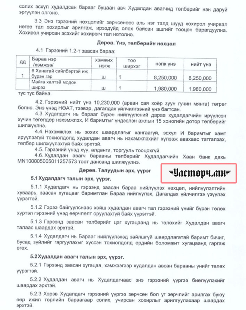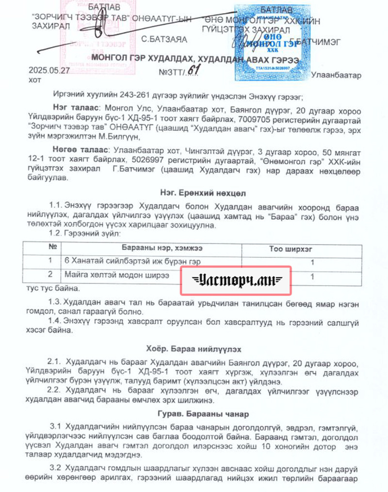 БАРИМТ: 2025 оны 05 дугаар сарын 27-нд “Зорчигч тээвэр тав” ОНӨААТҮГ-ын захирал С.БАТЗАЯА нь “ӨНӨ МОНГОЛ ГЭР” ХХК-ийн захирал Г.БАТЧИМЭГТЭЙ “Монгол гэр худалдах, худалдан авах” гэрээ байгуулж, 6 ханатай, сийлбэртэй, иж бүрэн гэрийг 8 сая 250 мянгаар, “Майга хөлтэй модон ширээ”-г 1 сая 980 мянган төгрөөр нийт 10 сая 230 мянган төгрөгөөр худалдан авчээ.