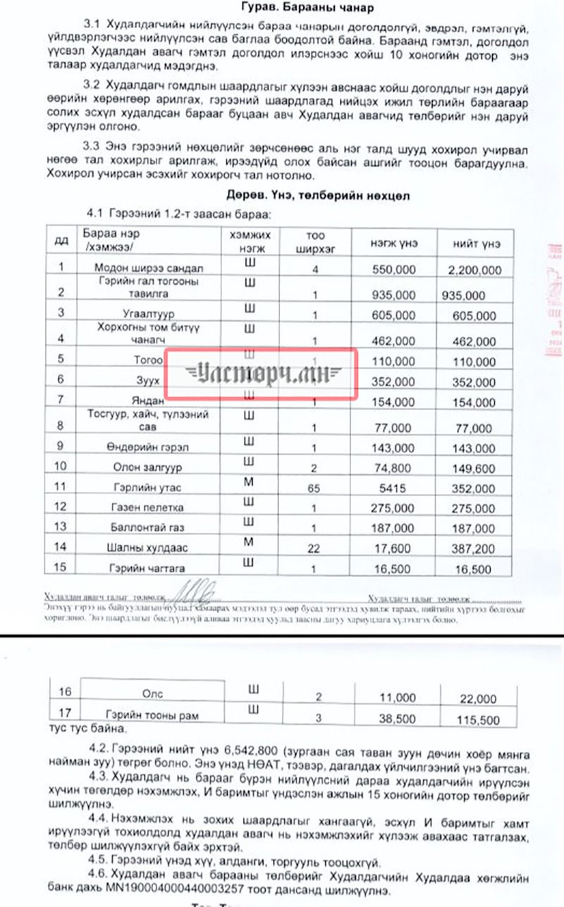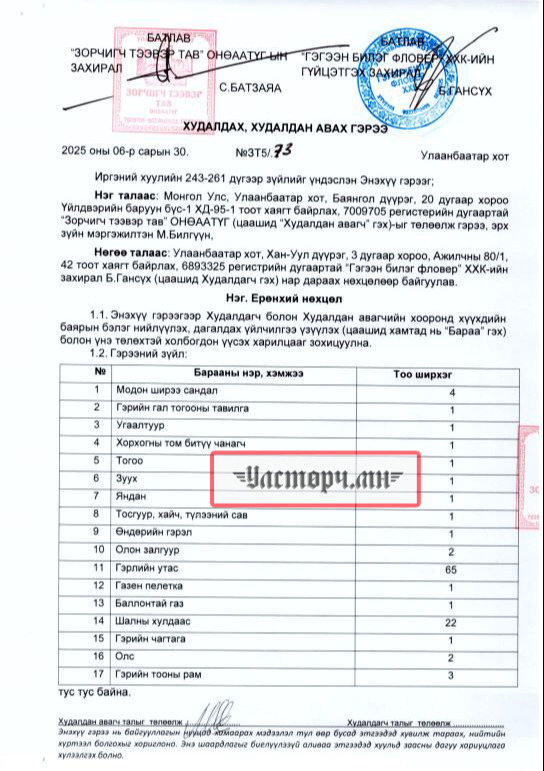 БАРИМТ: 2025 оны 06 дугаар сарын 30-нд “Зорчигч тээвэр тав” ОНӨААТҮГ-ын захирал С.БАТЗАЯА, “ГЭГЭЭН БИЛЭГ ФЛОВЕР” ХХК-ийн захирал Б.ГАНСҮХТЭЙ худалдах, худалдан авах гэрээ байгуулж өмнө сард авсан монгол гэртээ ашиглахаар модон ширээ сандал, угаалтуур, гэрийн гол тогооны тавилга, ХОРХОГНЫ ТОМ БИТҮҮ ЧАНАГЧ, тогоо, зуух яндаг, тосгуур хайч, түлээний сав, гэрлийн утас, өндрийн гэрэл, олон залгуур тэргүүтнийг 6 сая 542 мянган төгрөгөөр худалдан авчээ.