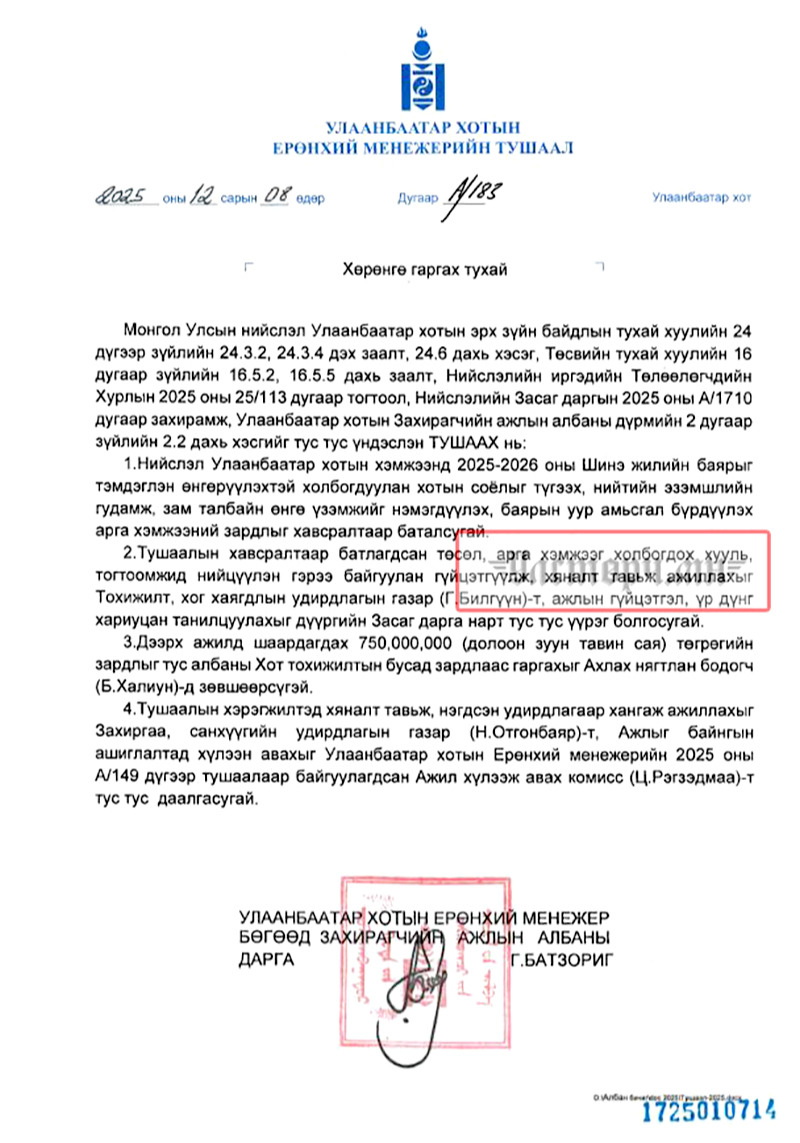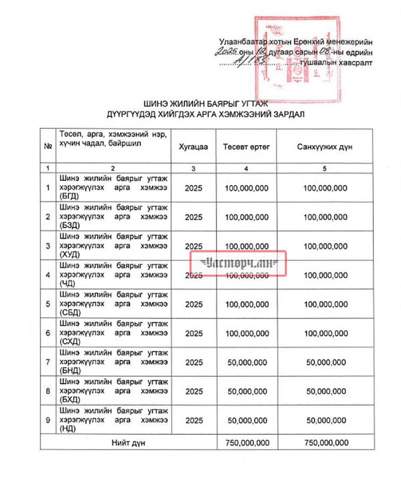 Гэтэл нийслэлийн 9 дүүргийн дарга төсвийн мөнгөөр “ёстой гараа угаажээ”. Тодруулбал, Улаанбаатар хотын Ерөнхий менежер Г.БАТЗОРИГИЙН А/183 тоот хөрөнгө гаргах тухай тушаалаар нийслэл Улаанбаатар хотод 2025-2026 оны Шинэ жилийн баярыг тэмдэглэн өнгөрүүлэхтэй холбогдуулан хотын соёлыг түгээх, нийтийн эзэмшлийн гудамж талбайн өнгө үзэмжийг нэмэгдүүлэх, баярын уур амьсгал оруулахаар болж 750 сая төгрөгийг зарцуулсан байна.