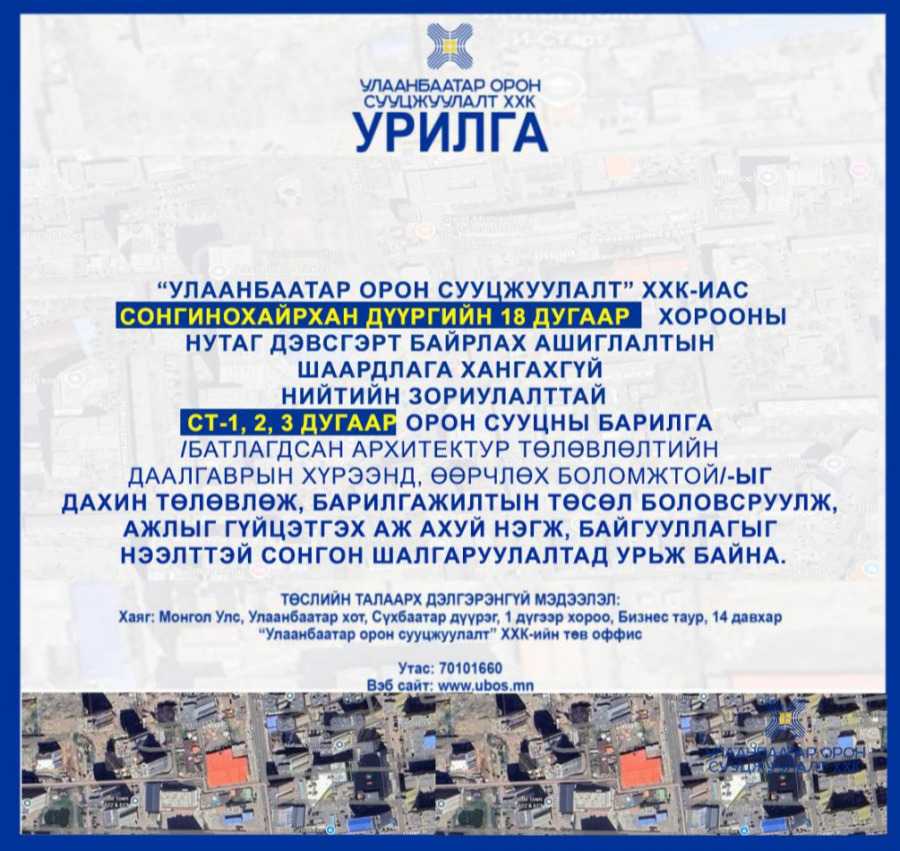 ТӨСЛИЙН ТАЛААРХ ДЭЛГЭРЭНГҮЙ МЭДЭЭЛЭЛ: Хаяг: Монгол Улс, Улаанбаатар хот, Сүхбаатар дүүрэг, 1 дүгээр хороо, Бизнес таур, 14 давхар “Улаанбаатар орон сууцжуулалт” ХХК-ийн төв оффис Утас: 70101660 Вэб сайт: www.ubos.mn